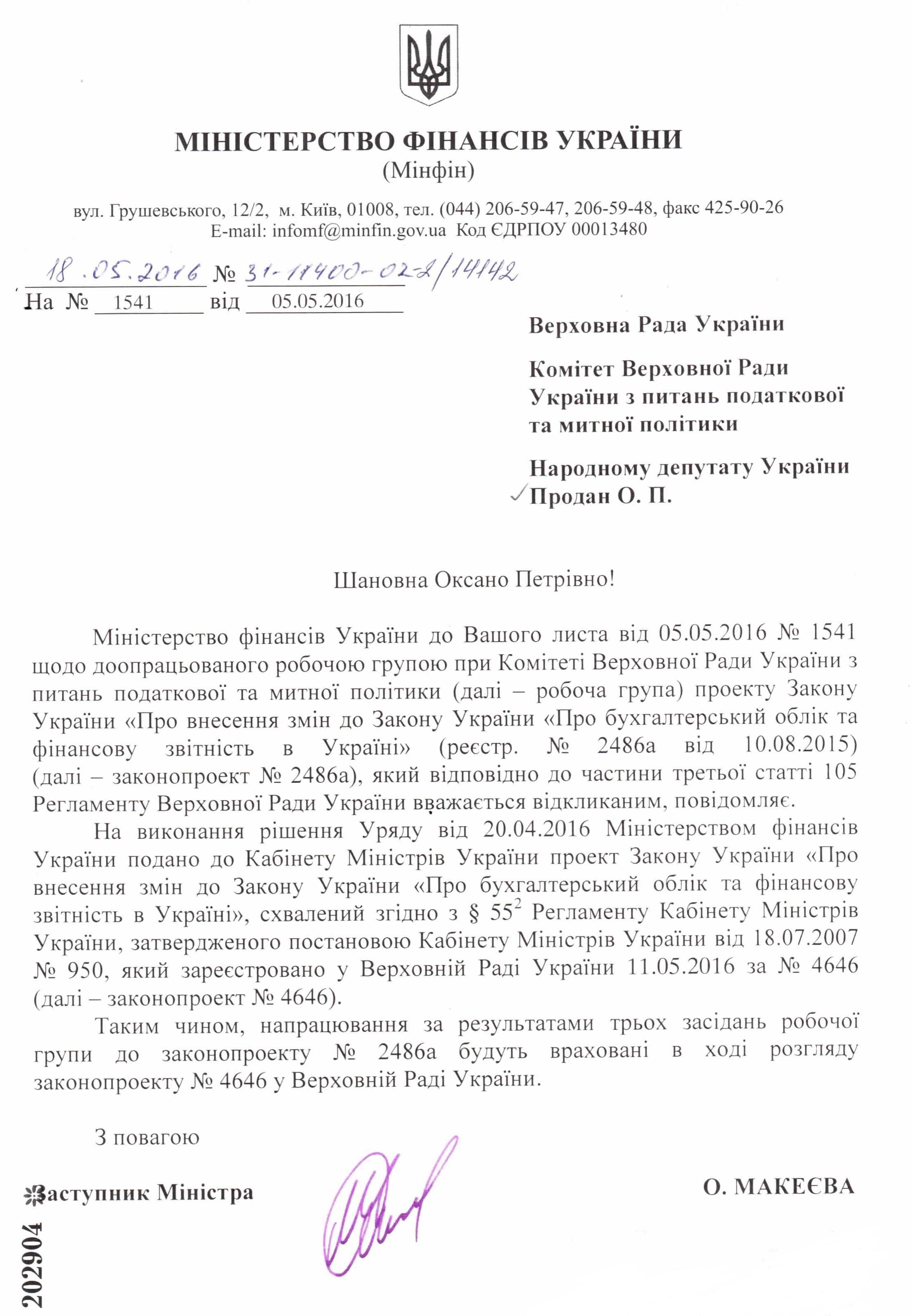 Вхідна документація > Відповідь Міністерства фінансів України на депутатське звернення щодо внесення на розгляд Верховної Ради України доопрацьованої робочою групою редакції законопроекту “Про внесення змін до Закону України “Про бухгалтерський облік та фінансову звітність в Україні”