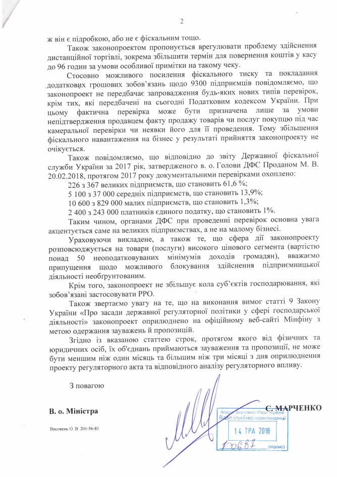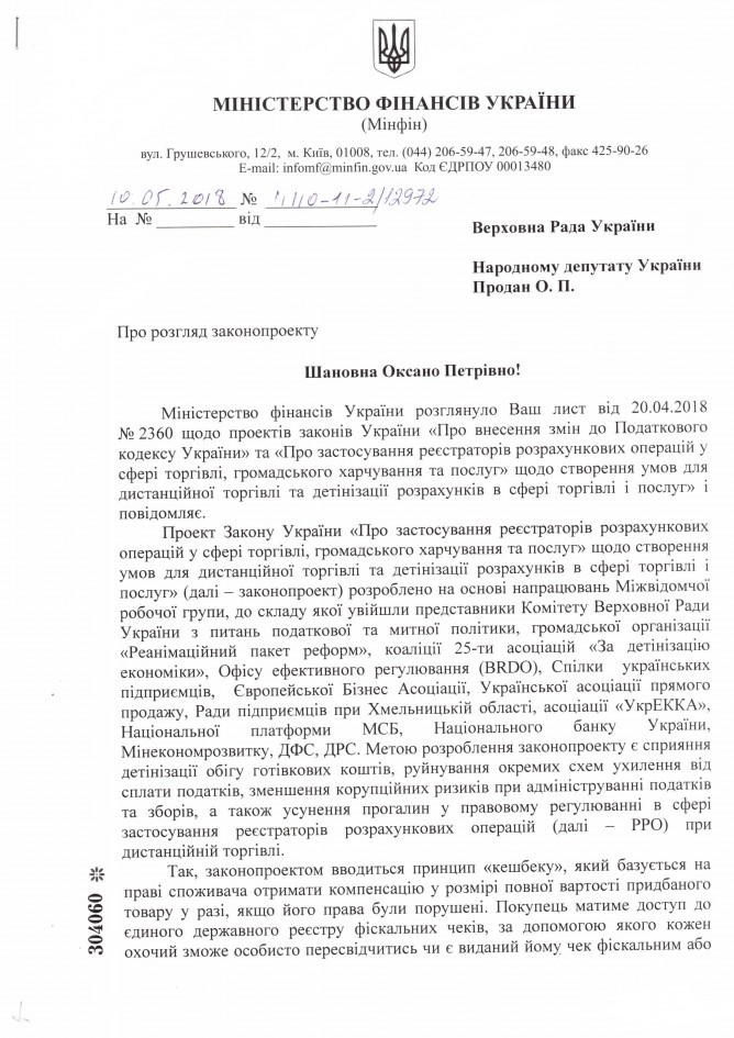 Відповідь Міністерства фінансів України на депутатське звернення щодо законопроекту «Про внесення змін до Податкового кодексу України та Закону України «Про застосування реєстраторів розрахункових операцій у сфері торгівлі, громадського харчування та послуг» щодо створення умов для дистанційної торгівлі та детінізації розрахунків в сфері торгівлі і послуг»