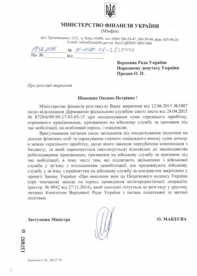 Головна > Верховна Рада України > Вхідна документація > Відповідь Міністерства фінансів України на депутатське звернення щодо звільнення від оподаткування суми середнього заробітку, отриманого працівниками, призваними на військову службу за призовом під час мобілізації