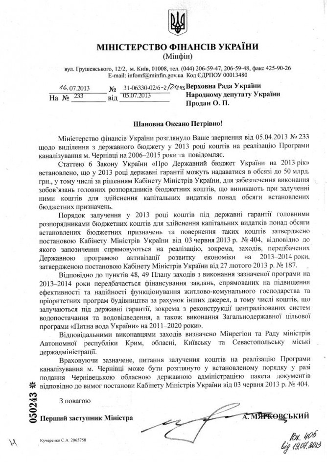 01Сер Коментування вимкнено Відповідь Міністерства фінансів України щодо забезпечення державної підтримки у здійсненні заходів, передбачених Програмою каналізування м. Чернівці на 2006 – 2015 роки