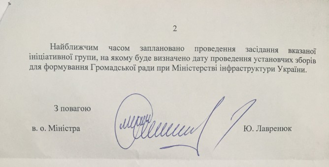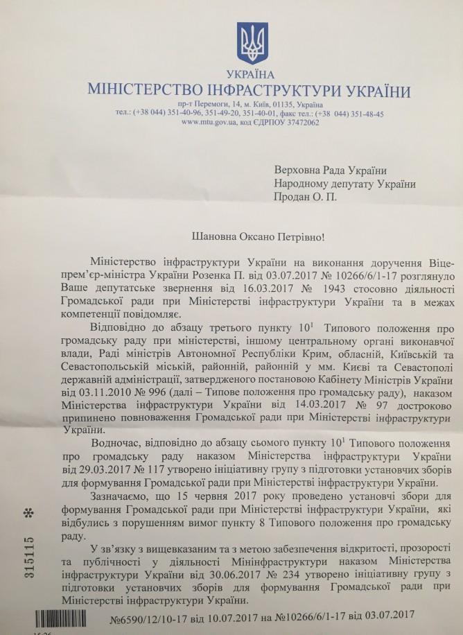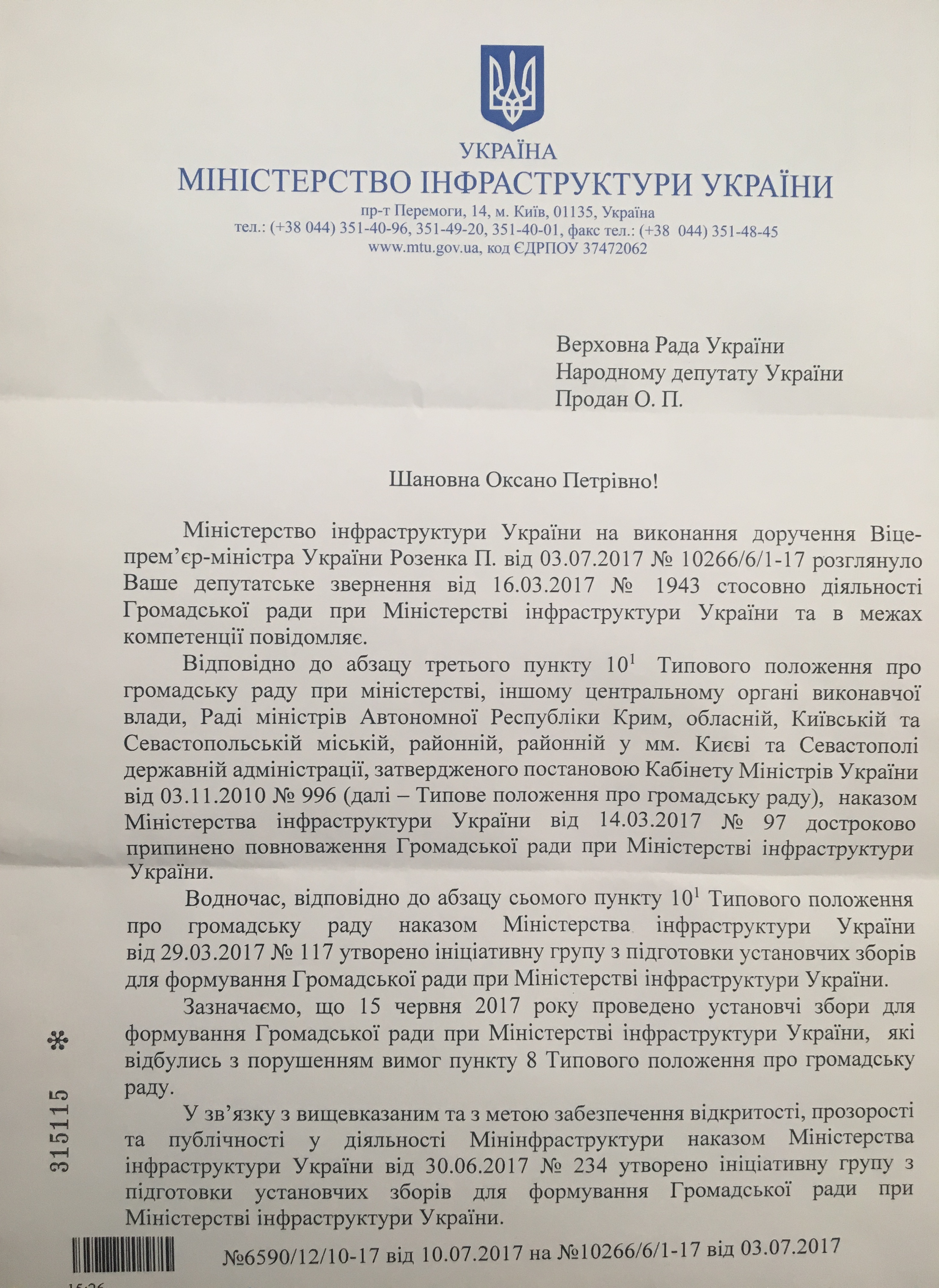 Відповідь Міністерства інфраструктури України на депутатське звернення до прем’єр-міністра України В.Б. Гройсмана щодо блокування діяльності Громадської ради при Міністерстві інфраструктури України