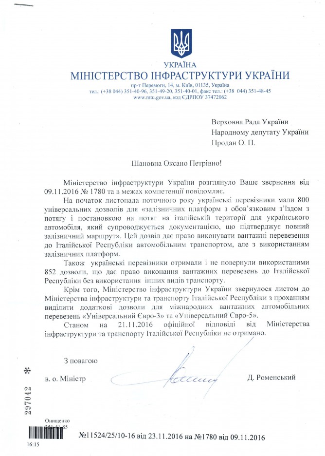 30Лис Коментування вимкнено Відповідь Міністерства інфраструктури України на депутатське звернення щодо сприяння у виділенні додаткової квоти дозволів на міжнародні перевезення вантажів автомобільним транспортом до Італії ДЕПУТАТСЬКЕ ЗВЕРНЕННЯ