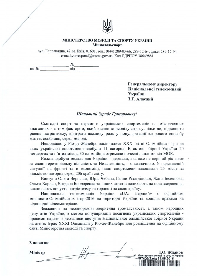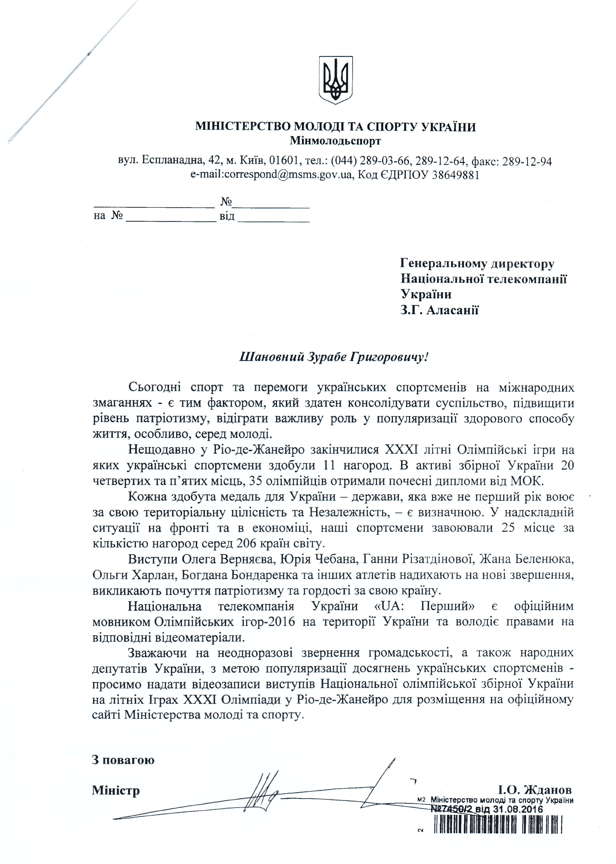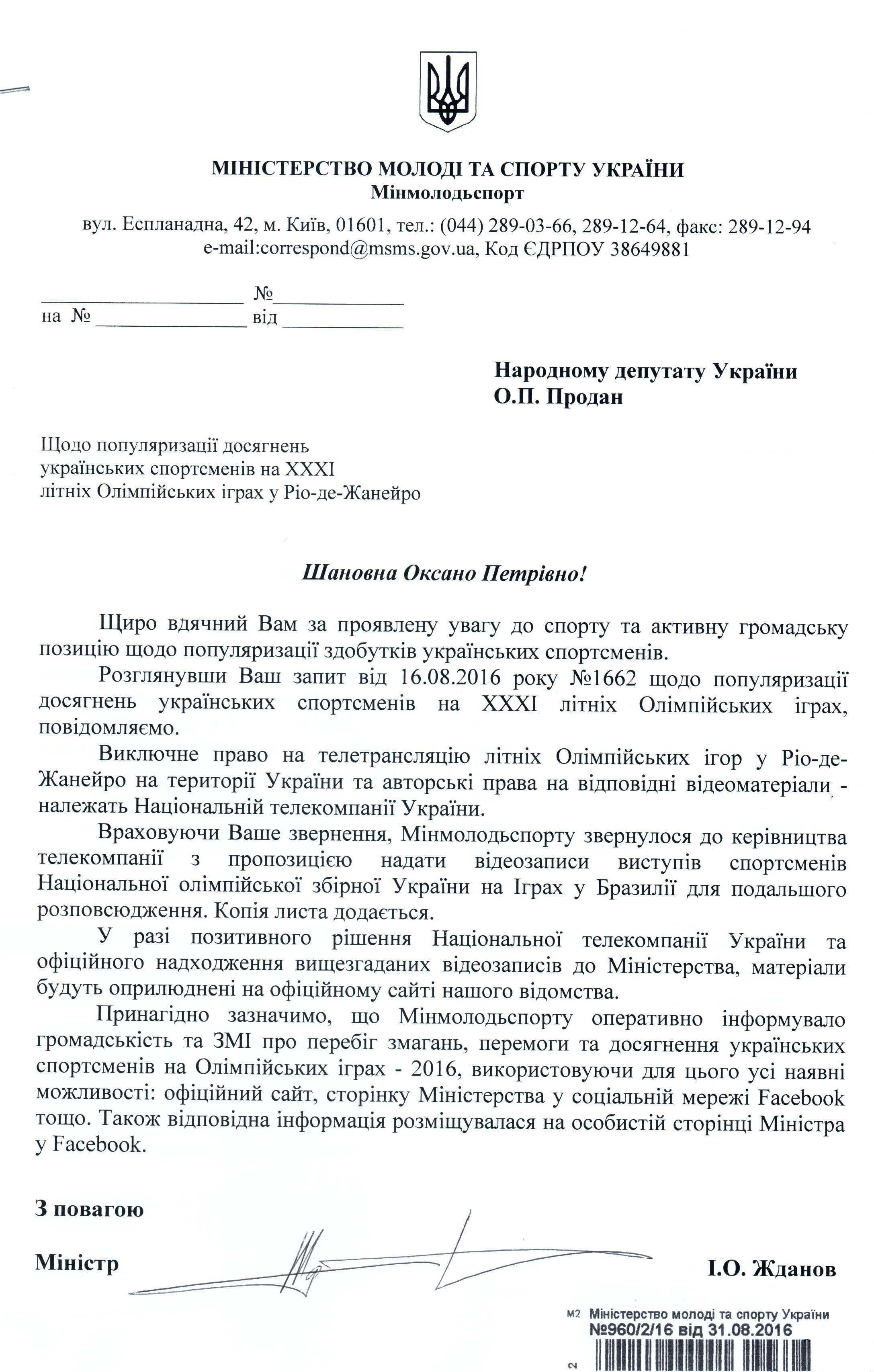 14Вер Коментування вимкнено Відповідь Міністерства молоді та спорту України на депутатське звернення щодо популяризації досягнень українських спортсменів на ХХХІ літніх Олімпійських Іграх у Ріо-де-Жанейро ДЕПУТАТСЬКЕ ЗВЕРНЕННЯ