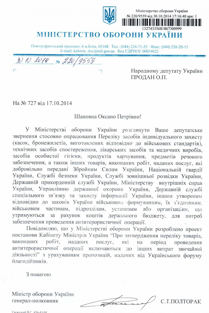 Вхідна документація > Відповідь Міністерства оборони України на депутатське зверненя щодо врахування пропозицій благодійних організацій при підготовці проектів нормативно-правових актів на виконання Закону України № 1668-VII