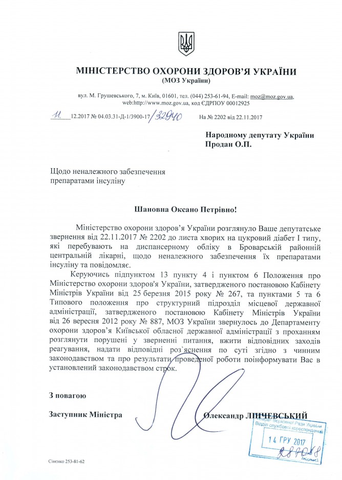 13Січ Коментування вимкнено Відповідь Міністерства охорони здоров’я України на депутатське звернення щодо неналежного забезпечення пацієнтів Броварської районної центральної лікарні препаратами інсуліну ДЕПУТАТСЬКЕ ЗВЕРНЕННЯ