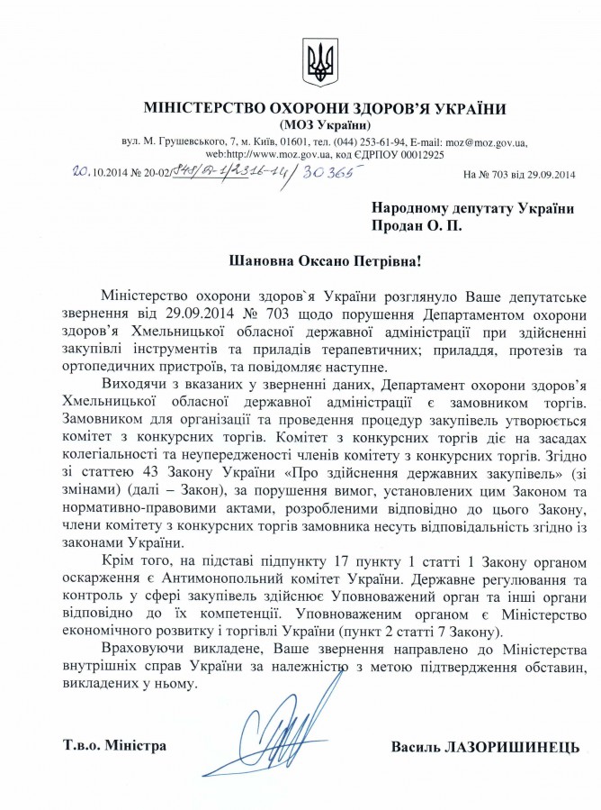 11Лис Коментування вимкнено Відповідь Міністерства охорони здоров’я України на депутатське звернення щодо порушень законодавства при проведенні тендеру Департаментом охорони здоров’я Хмельницької ОДА ДЕПУТАТСЬКЕ ЗВЕРНЕННЯ