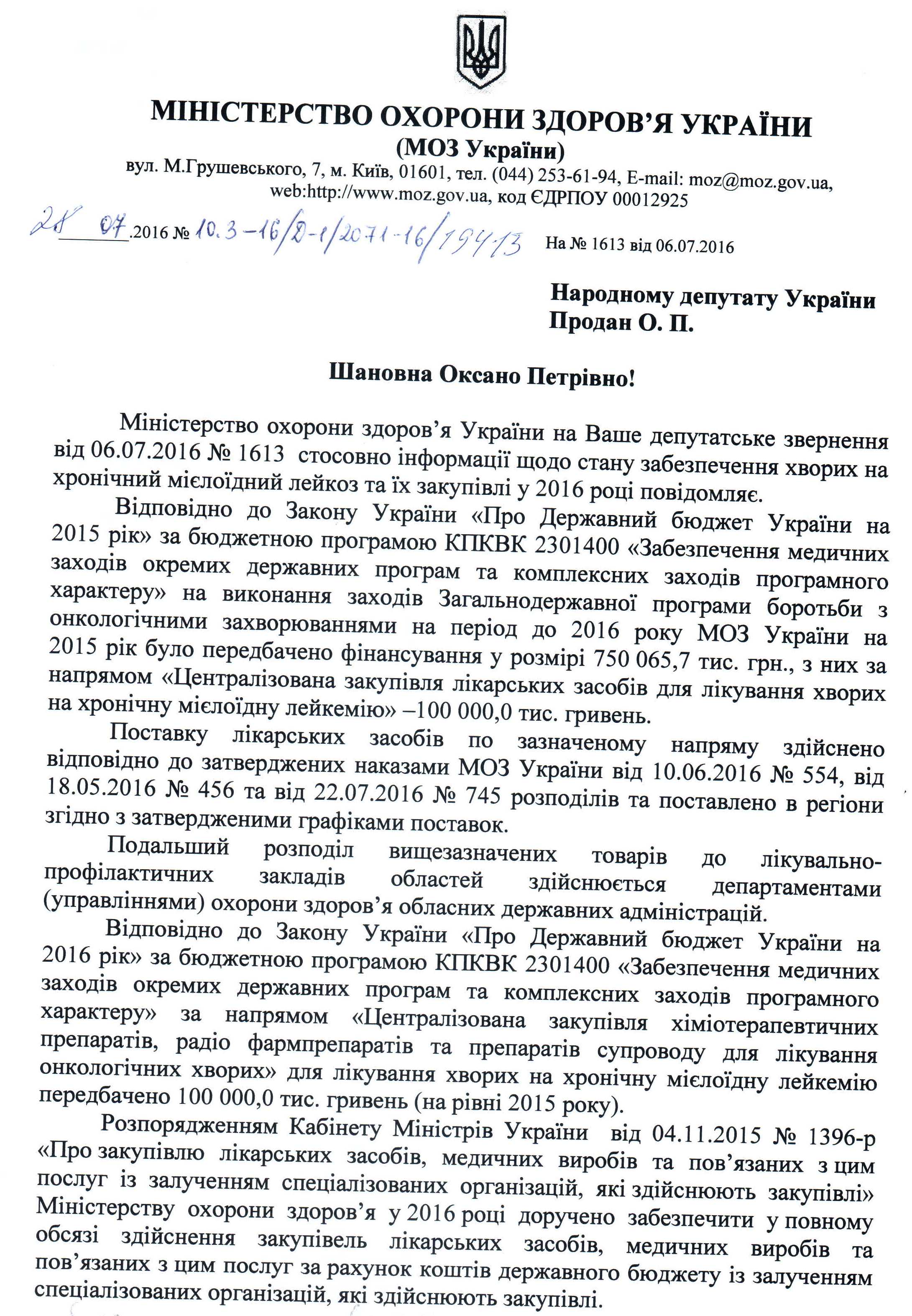 12Сер Коментування вимкнено Відповідь Міністерства охорони здоров’я України на депутатське звернення щодо забезпечення ліками хворих на хронічний мієлоїдний лейкоз ДЕПУТАТСЬКЕ ЗВЕРНЕННЯ
