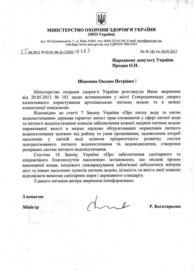 08Лип Коментування вимкнено Відповідь Міністерства охорони здоровя України стосовно встановлення у м. Сєвєродонецьку джерел колективного користування артезіанською водою