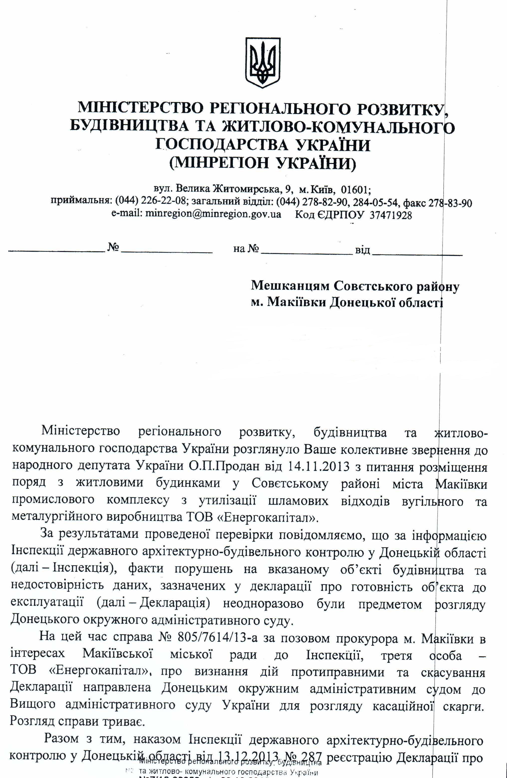 14Січ Коментування вимкнено Відповідь Міністерства регіонального розвитку, будівництва та ЖКГ щодо скасування реєстрації Декларації на початок виконання будівельних робіт ТОВ «Енергокапітал» ДЕПУТАТСЬКЕ ЗВЕРНЕННЯ