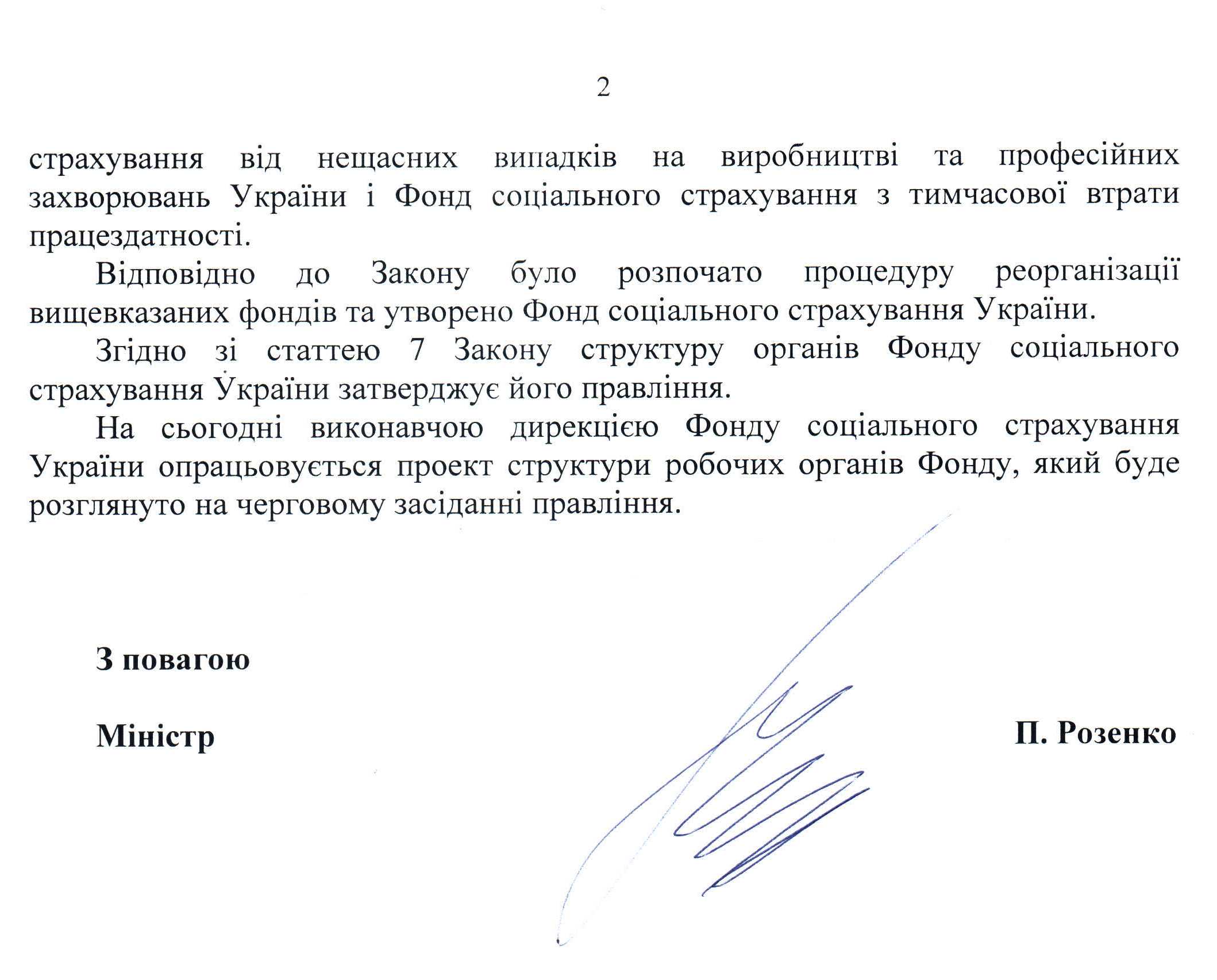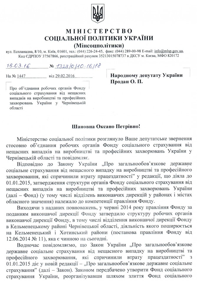 Відповідь Міністерства соціальної політики України на депутатське звернення щодо об’єднання районних відділень виконавчої дирекції Фонду соціального страхування від нещасних випадків на виробництві та професійних захворювань у Чернівецькій області