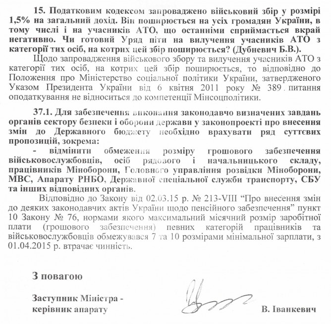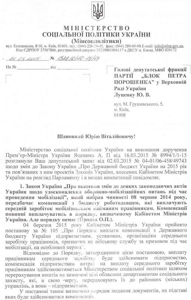 Вхідна документація > Відповідь Міністерства соціальної політики України щодо компенсації з бюджету роботодавцям середнього заробітку, виплаченого мобілізованим працівникам, військового збору та відміни обмеження розміру грошового забезпечення військовослужбовців