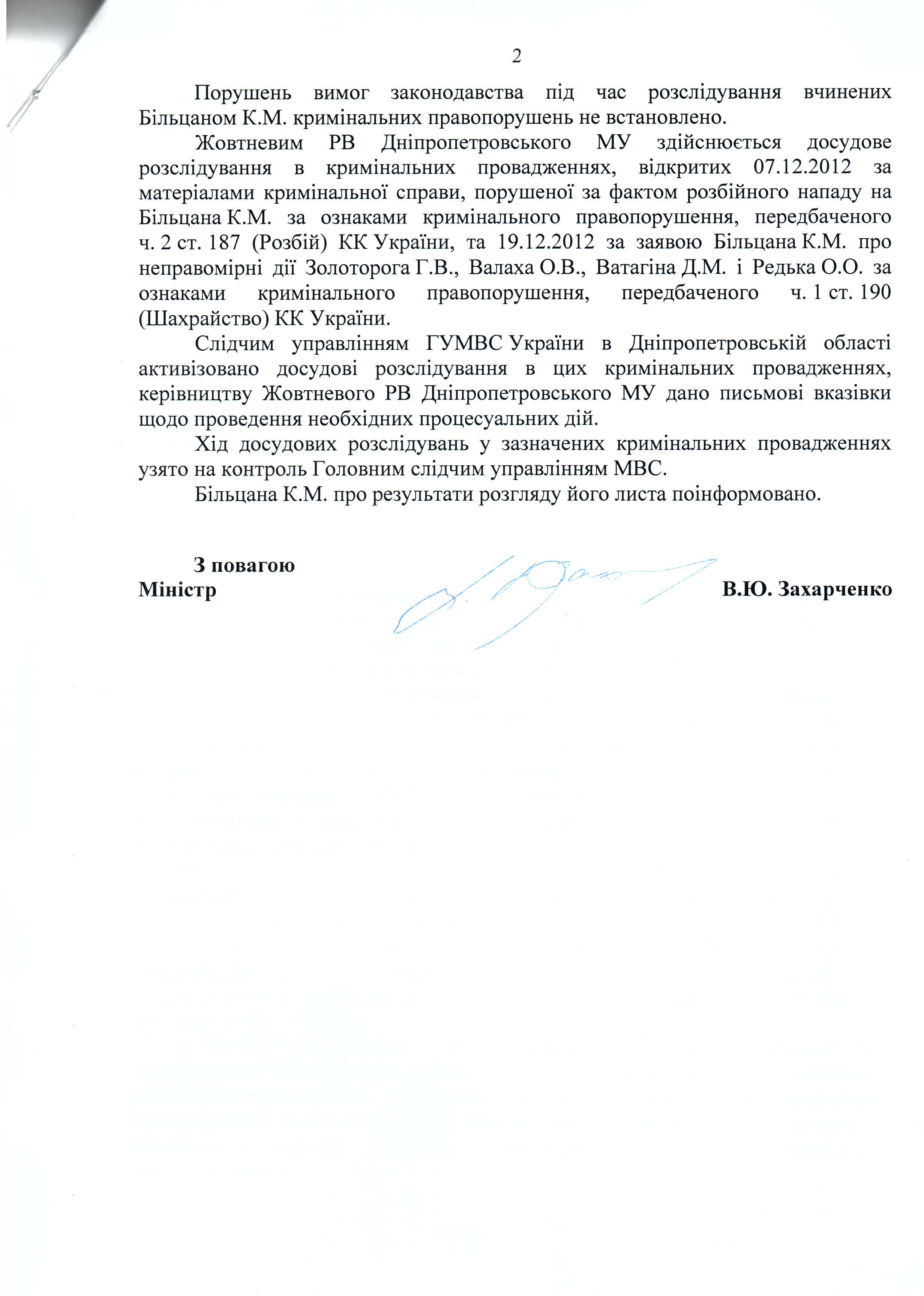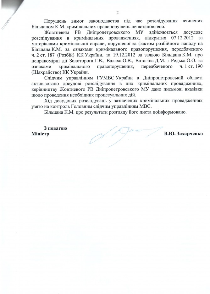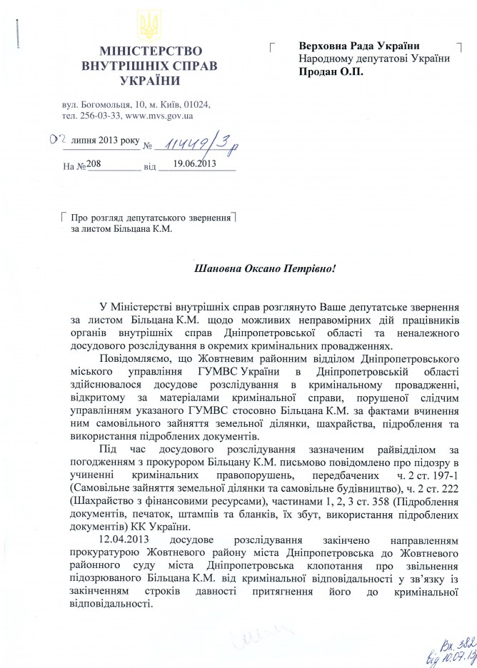 12Лип Коментування вимкнено Відповідь Міністерства внутрішніх справ України на депутатське звернення щодо порушень під час досудового розслідування у справі К.Більцана
