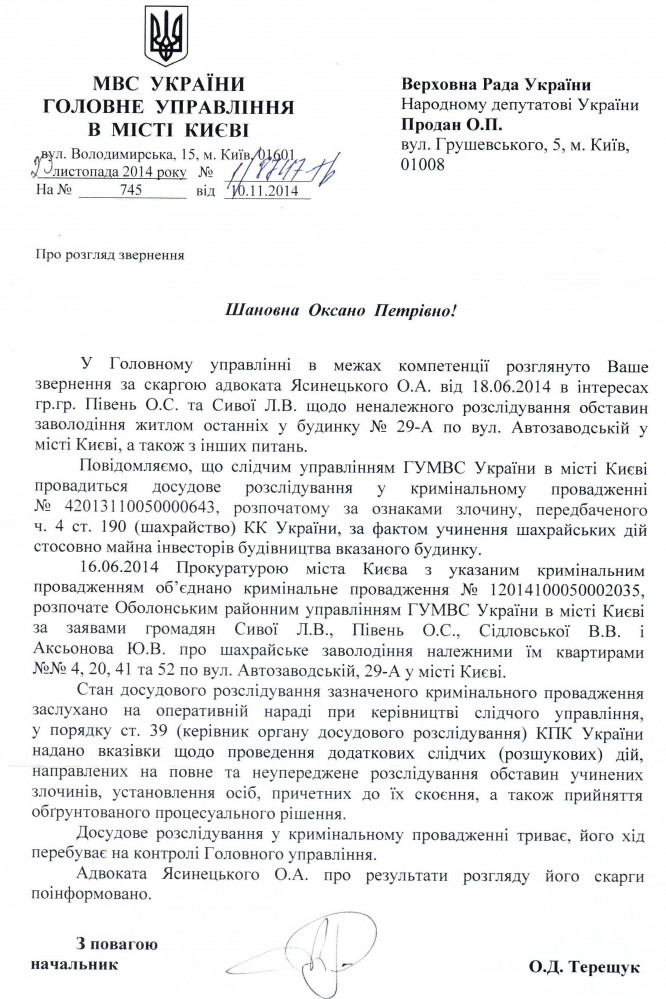 20Січ Коментування вимкнено Відповідь Міністерства внутрішніх справ України на депутатське звернення щодо неналежного розслідування обставин шахрайського заволодіння житлом