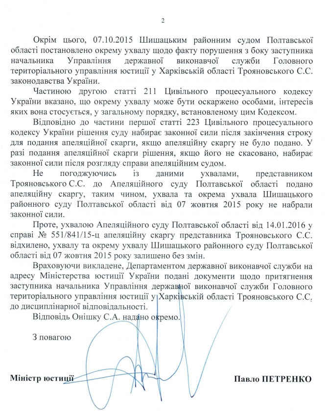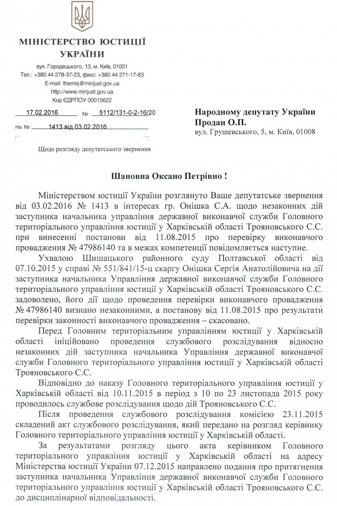 Вхідна документація > Відповідь Міністерства юстиції України на депутатське звернення щодо перевищення посадових прав заступником начальника Управління державної виконавчої служби Головного територіального управління юстиції у Харківській області