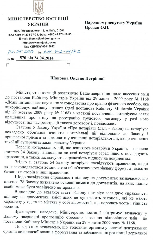 03Чер Коментування вимкнено Відповідь Міністерства юстиції України на депутатське звернення щодо спрощення процедури реєстрації трудових договорів у державній службі зайнятості ДЕПУТАТСЬКЕ ЗВЕРНЕННЯ