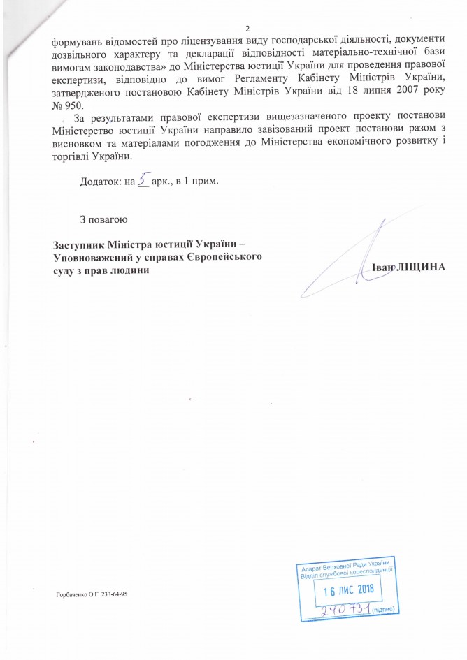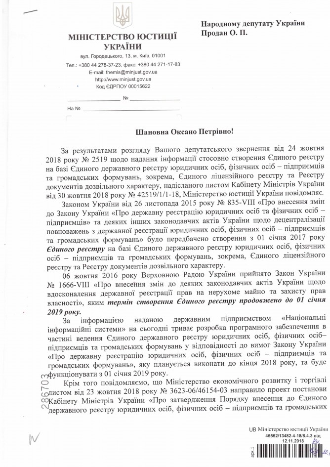 Відповідь Міністерства юстиції України на депутатське звернення щодо створення та ведення Єдиного державного реєстру