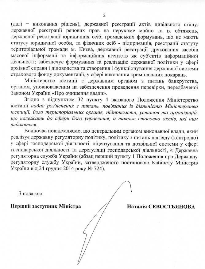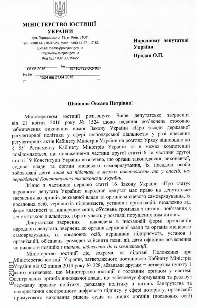 Відповідь Міністерства юстиції України на депутатське звернення щодо забезпечення виконання вимог Закону України «Про засади державної регуляторної політики у сфері господарської діяльності»