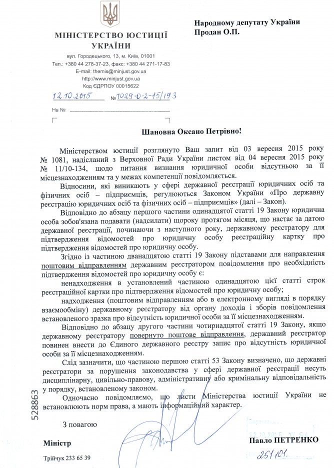 26Жов Коментування вимкнено Відповідь Міністерства юстиції України на депутатський запит щодо визнання юридичної особи відсутньою за її місцезнаходженням ДЕПУТАТСЬКИЙ ЗАПИТ