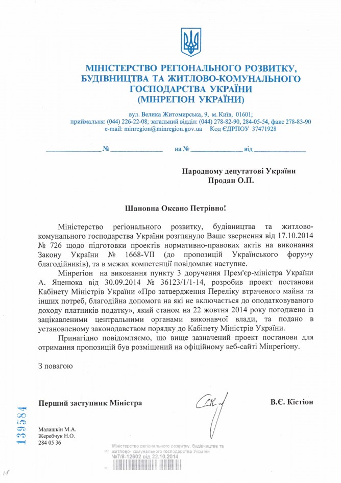 30Жов Коментування вимкнено Відповідь Мінрегіонбуду щодо підготовки Переліку втраченого майна та інших потреб, благодійна допомога на які не включається до оподатковуваного доходу платників податків ДЕПУТАТСЬКЕ ЗВЕРНЕННЯ