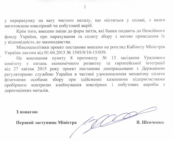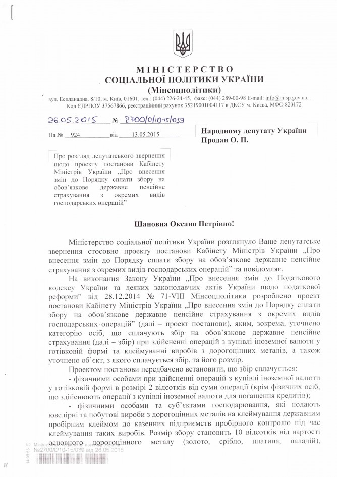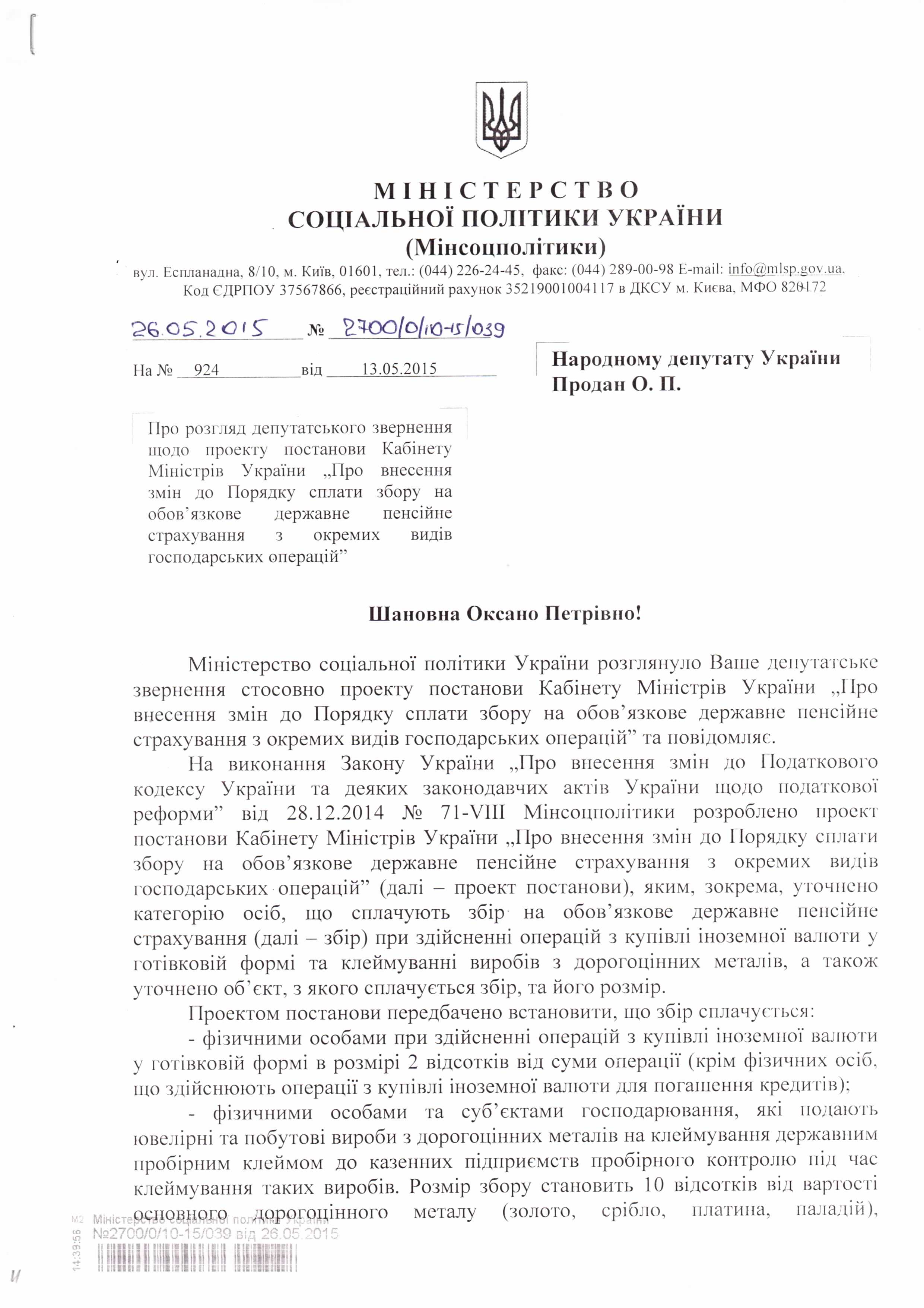 Відповідь Мінсоцполітики на депутатське звернення щодо проекту постанови КМУ «Про внесення змін до Порядку сплати збору на обов’язкове державне пенсійне страхування з окремих видів господарських операцій»