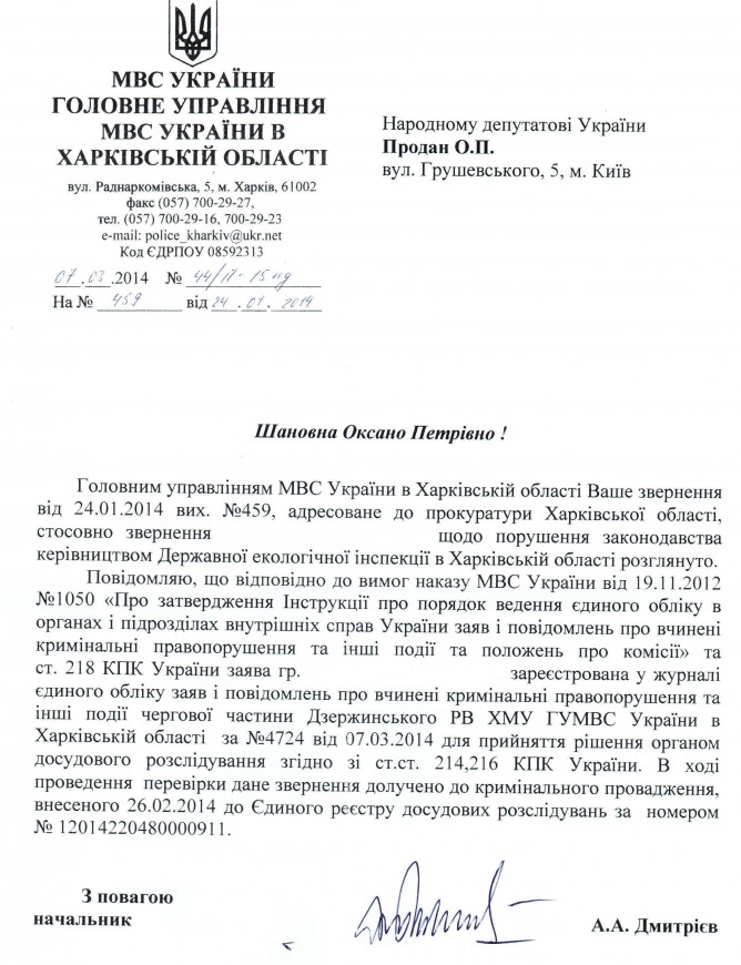 08Кві Коментування вимкнено Відповідь МВС у Харківській області на депутатське звернення щодо незаконних дій посадових осіб Державної екологічної інспекції у Харківській області, які призвели до розтрати бюджетних коштів