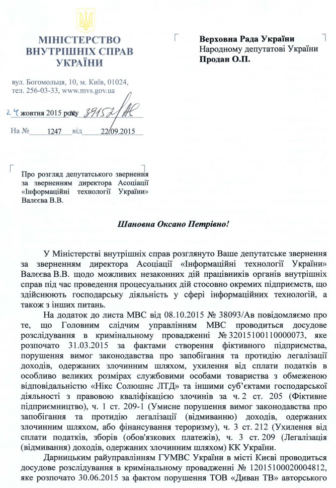 09Гру Коментування вимкнено Відповідь МВС України на депутатське звернення щодо дотримання вимог кримінального процесуального законодавства при досудових розслідуваннях на підприємствах ІТ-галузі ДЕПУТАТСЬКЕ ЗВЕРНЕННЯ ВІДПОВІДЬ МВС УКРАЇНИ ВІД 08.10.2015 РОКУ