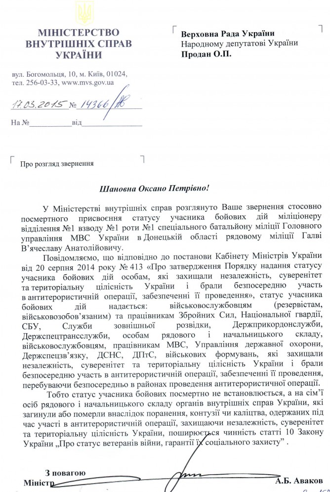 29Кві Коментування вимкнено Відповідь МВС України на депутатське звернення щодо посмертного присвоєння статусу учасника бойових дій рядовому міліції В.А. Галві
