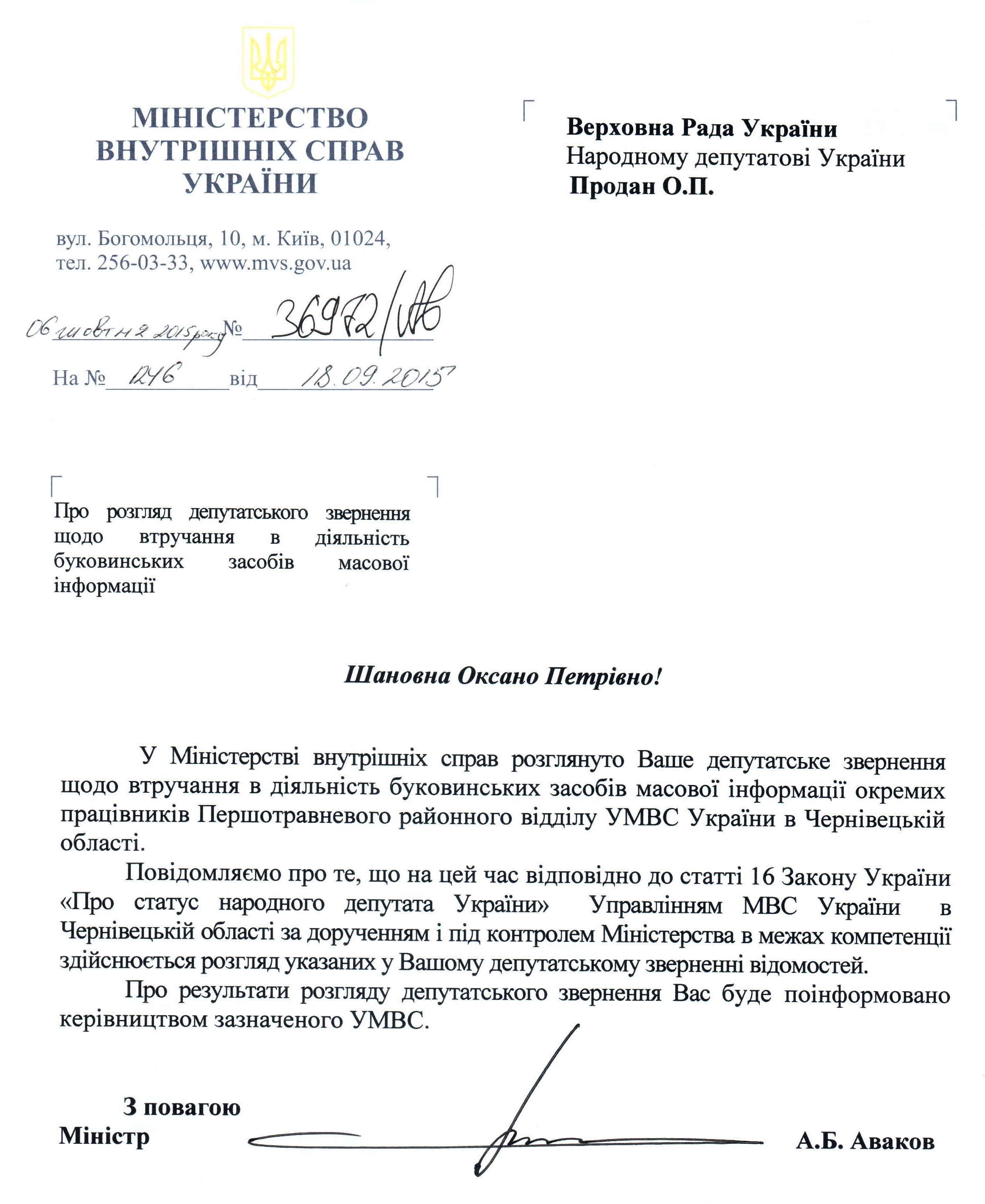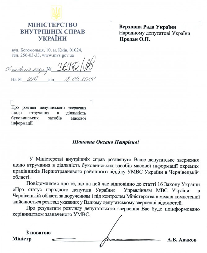 13Жов Коментування вимкнено Відповідь МВС України на депутатське звернення щодо втручання у діяльність буковинських ЗМІ ДЕПУТАТСЬКЕ ЗВЕРНЕННЯ