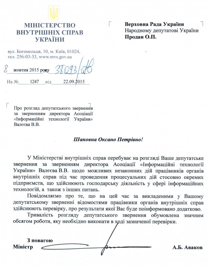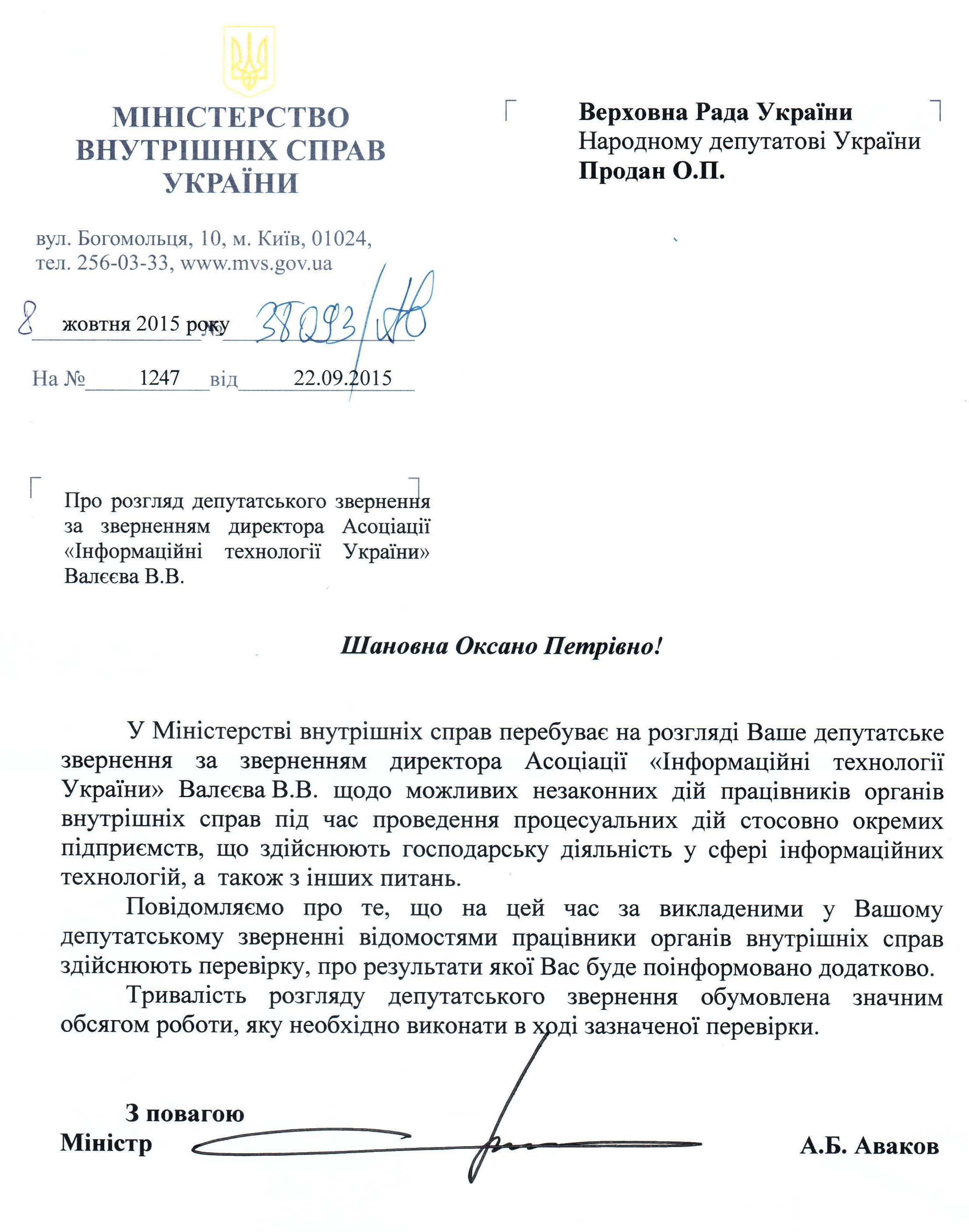 Вхідна документація > Відповідь МВС України про продовження термінів розгляду депутатського звернення щодо дотримання вимог кримінального процесуального законодавства при досудових розслідуваннях на підприємствах ІТ-галузі