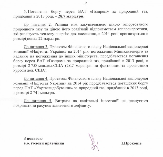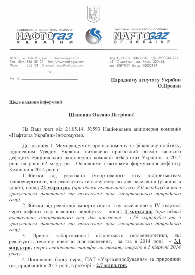 Відповідь НАК “Нафтогаз” на депутатське звернення щодо причин виникнення дефіциту компанії у розмірі 62 млрд. грн.