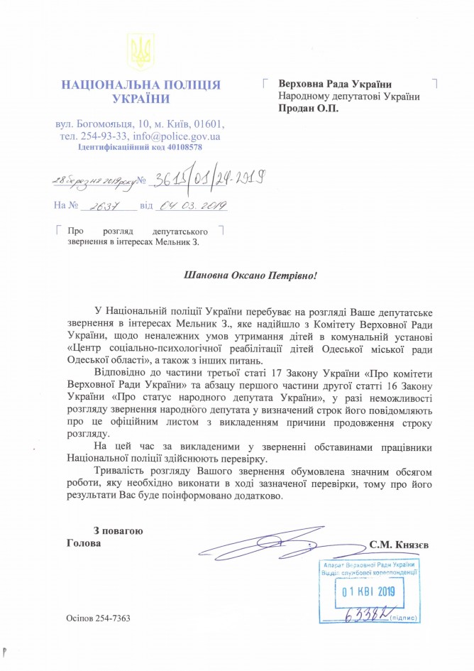 08Кві Коментування вимкнено Відповідь Національної поліції України на депутатське звернення щодо порушення прав дітей дирекцією та вихователями Одеського центру соціально-психологічної реабілітації дітей ДЕПУТАТСЬКЕ ЗВЕРНЕННЯ