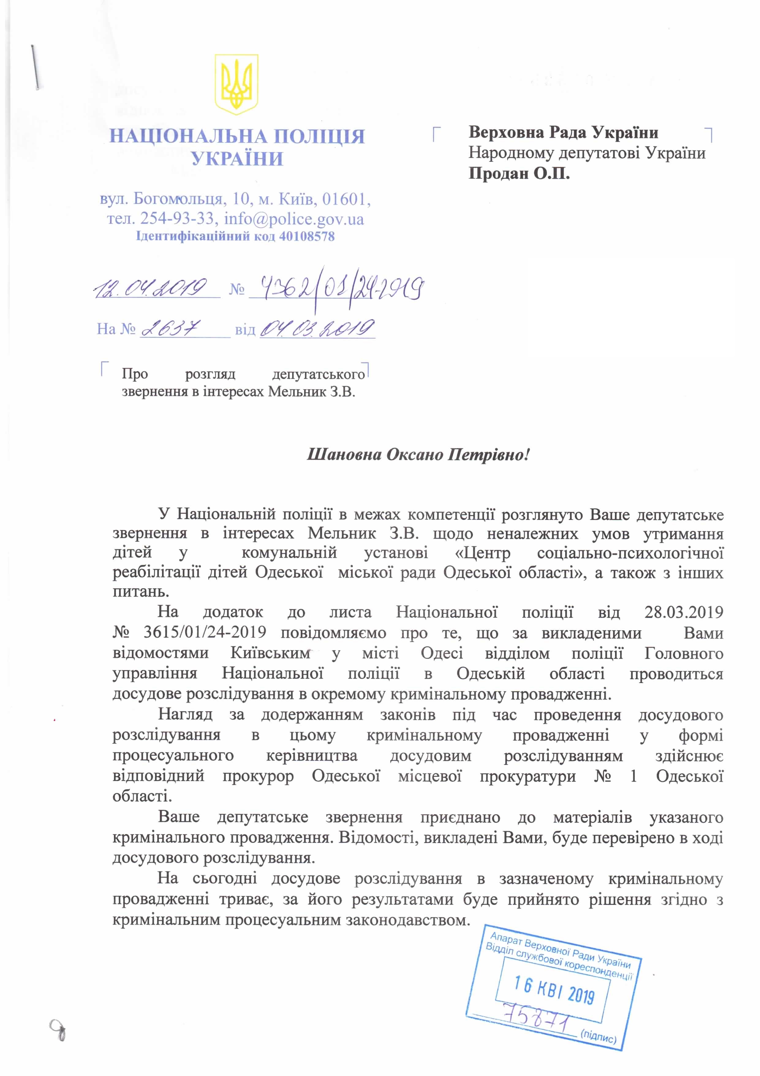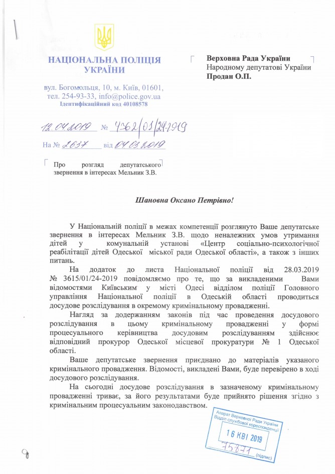 19Кві Коментування вимкнено Відповідь Національної поліції України на депутатське звернення щодо порушення прав дітей дирекцією та вихователями Одеського центру соціально-психологічної реабілітації дітей ДЕПУТАТСЬКЕ ЗВЕРНЕННЯ
