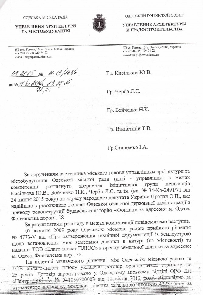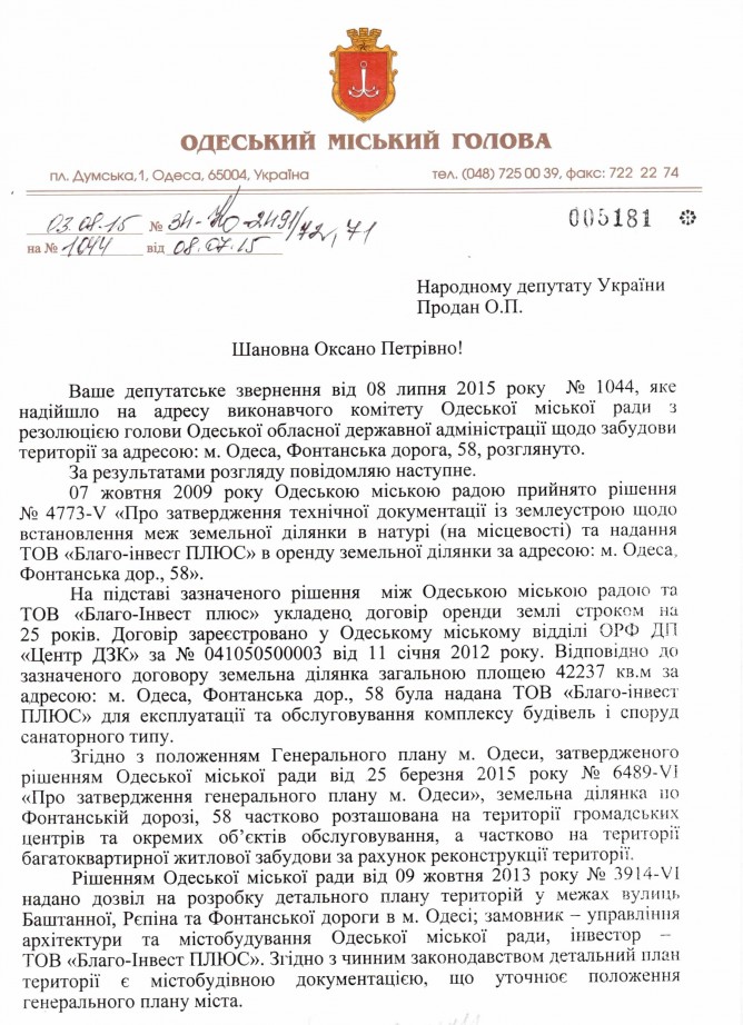 28Вер Коментування вимкнено Відповідь Одеського міського голови Г.Труханова на депутатське звернення щодо збереження рекреаційної зони на території санаторію “Фонтан” ДЕПУТАТСЬКЕ ЗВЕРНЕННЯ