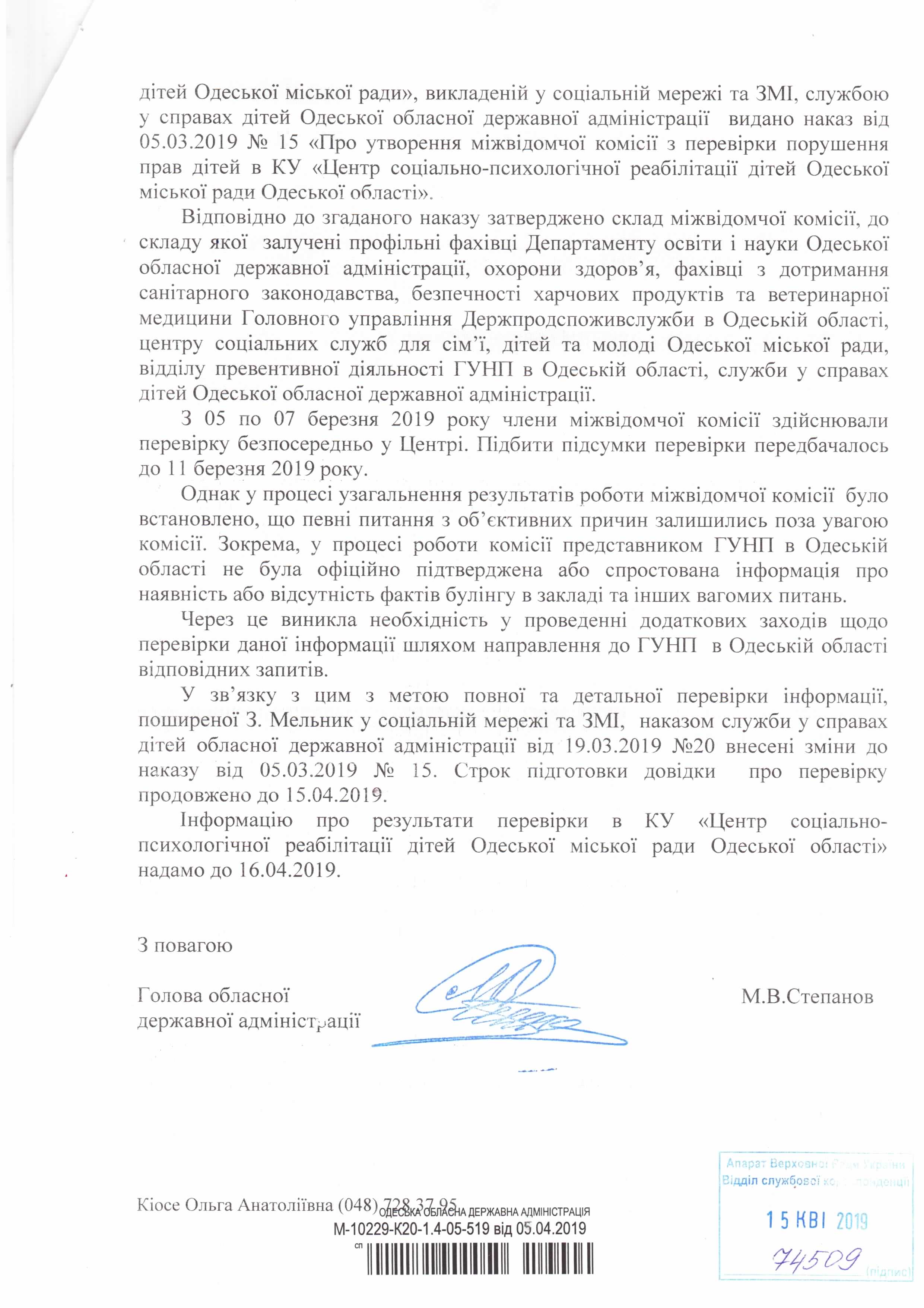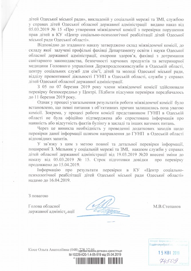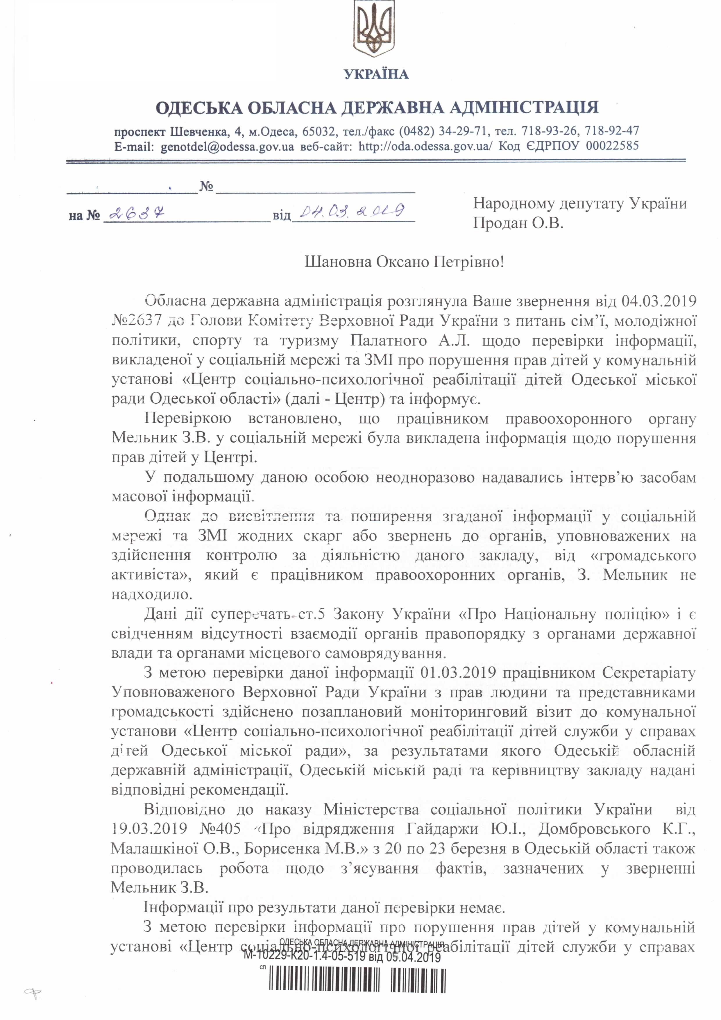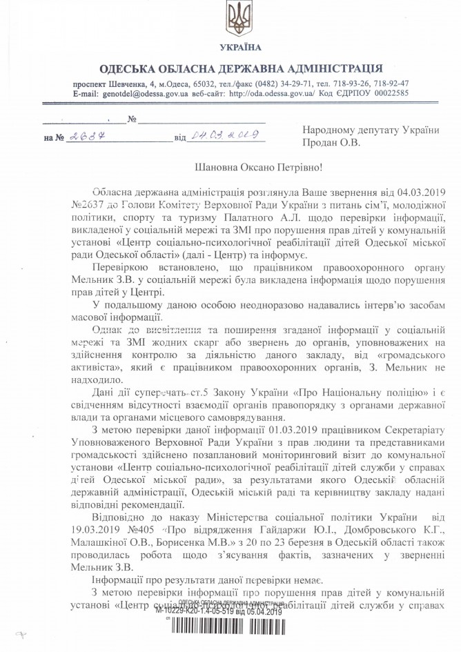 18Кві Коментування вимкнено Відповідь Одеської обласної державної адміністрації на депутатське звернення щодо порушення прав дітей дирекцією та вихователями Одеського центру соціально-психологічної реабілітації дітей ДЕПУТАТСЬКЕ ЗВЕРНЕННЯ