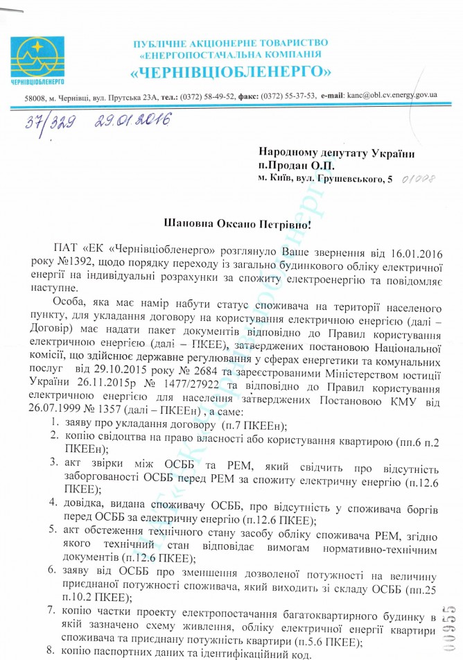 18Лют Коментування вимкнено Відповідь ПАТ «ЕК «Чернівціобленерго»на депутатське зверненя щодо порядку переходу на індивідуальні розрахунки за спожиту електроенергію ДЕПУТАТСЬКЕ ЗВЕРНЕННЯ