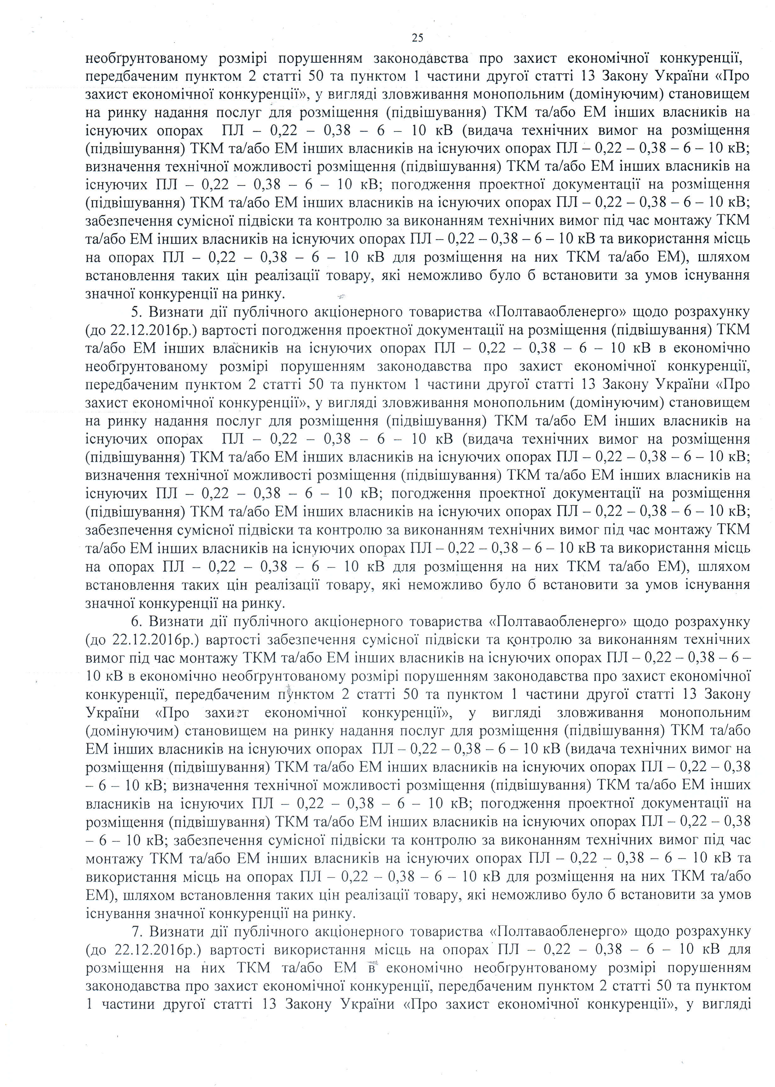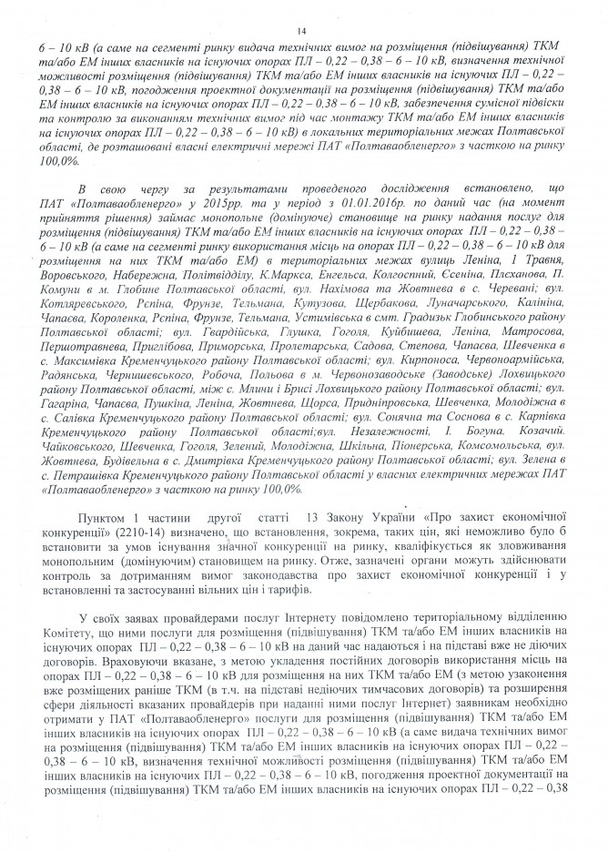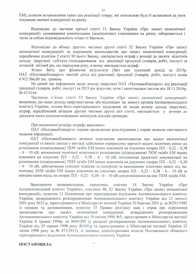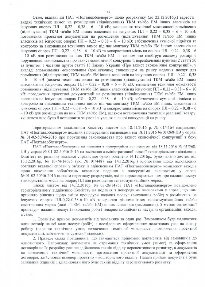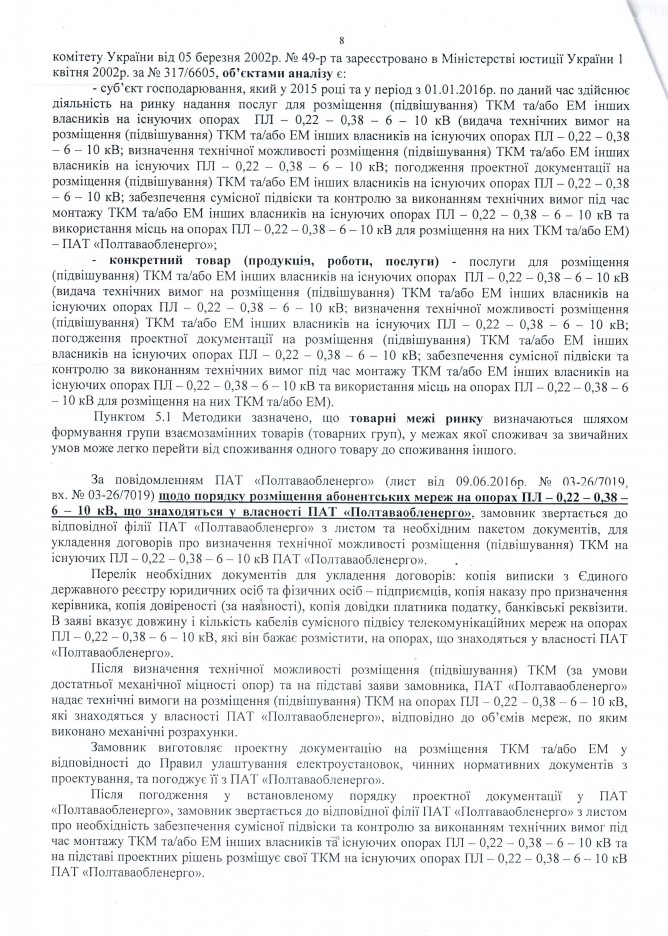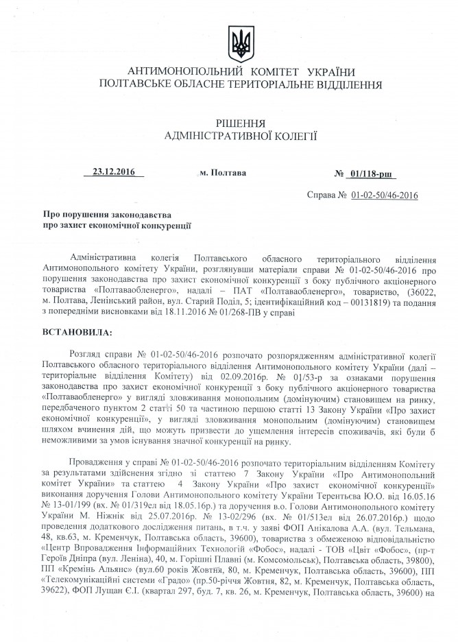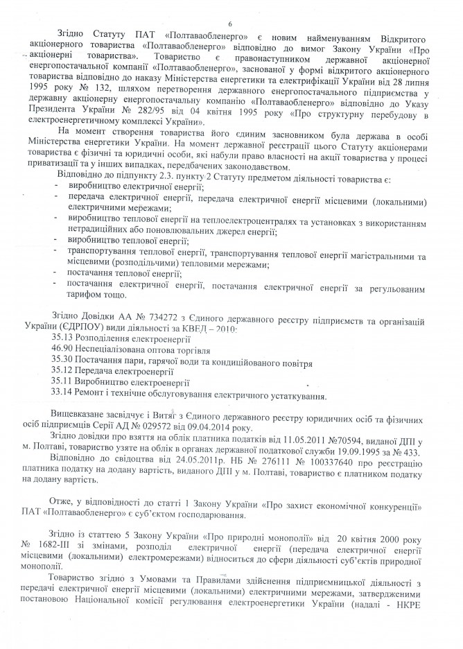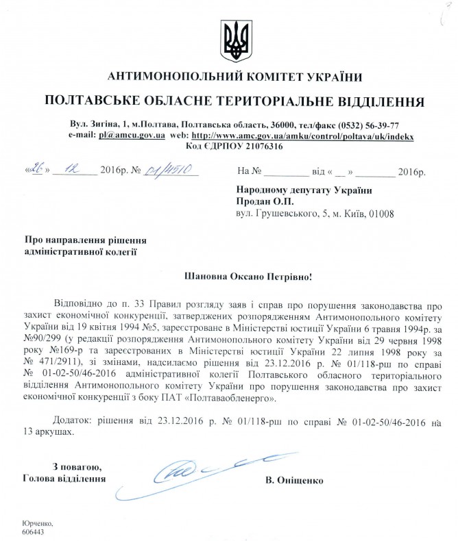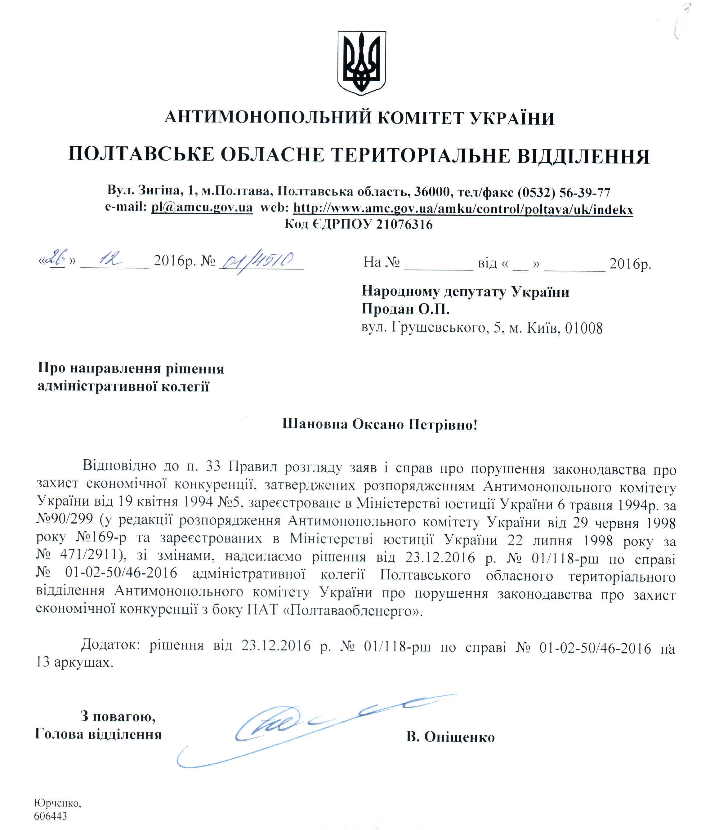 Вхідна документація > Відповідь Полтавського обласного територіального відділення Антимонопольного комітету України на депутатське звернення щодо порушень ПАТ «Полтаваобленерго» законодавства про захист економічної конкуренції