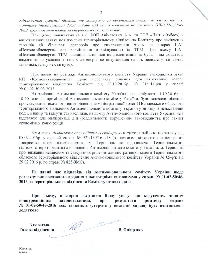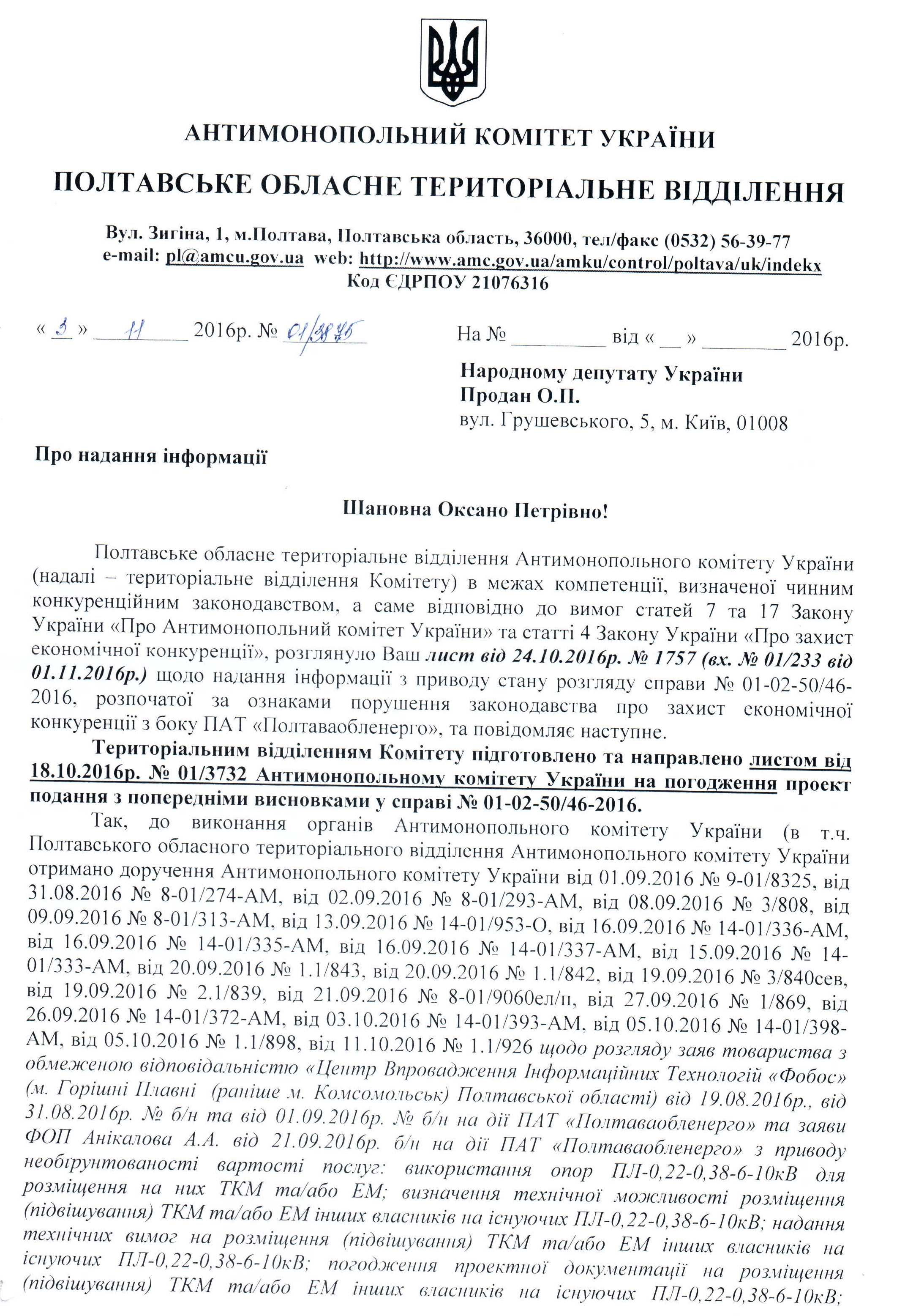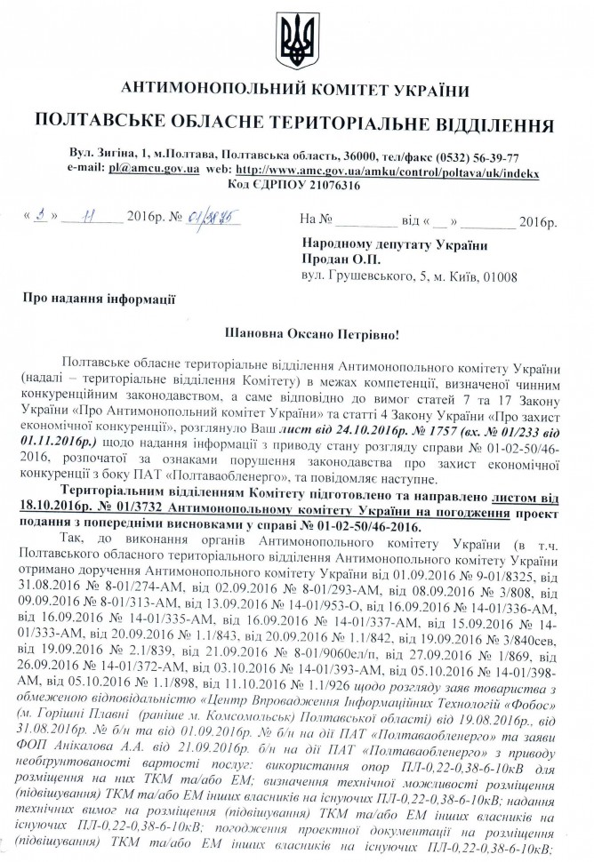 Вхідна документація > Відповідь Полтавського обласного територіального відділення Антимонопольного комітету України на депутатське звернення щодо порушень ПАТ «Полтаваобленерго» законодавства про захист економічної конкуренції