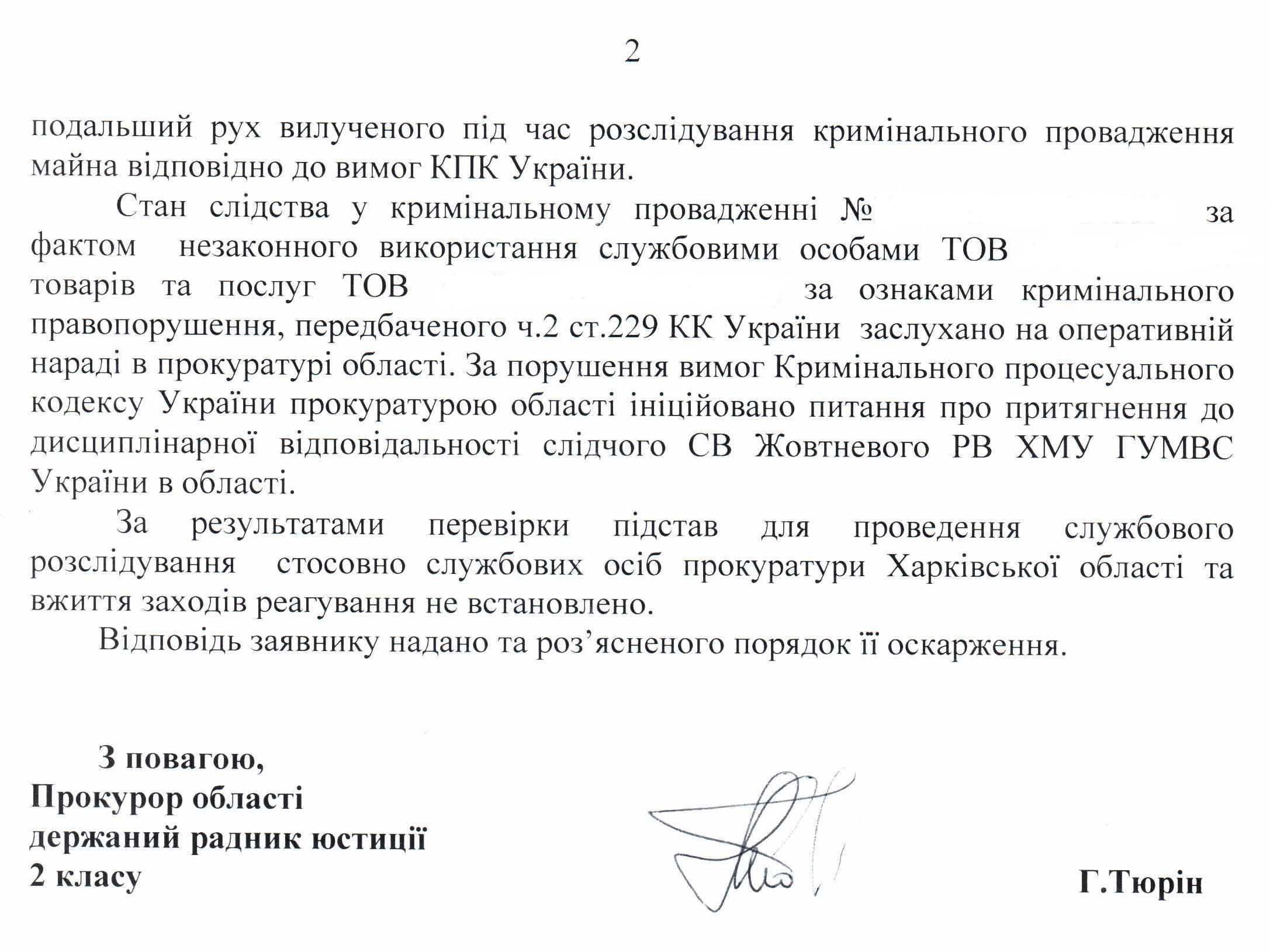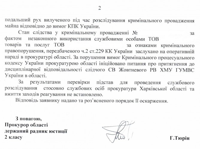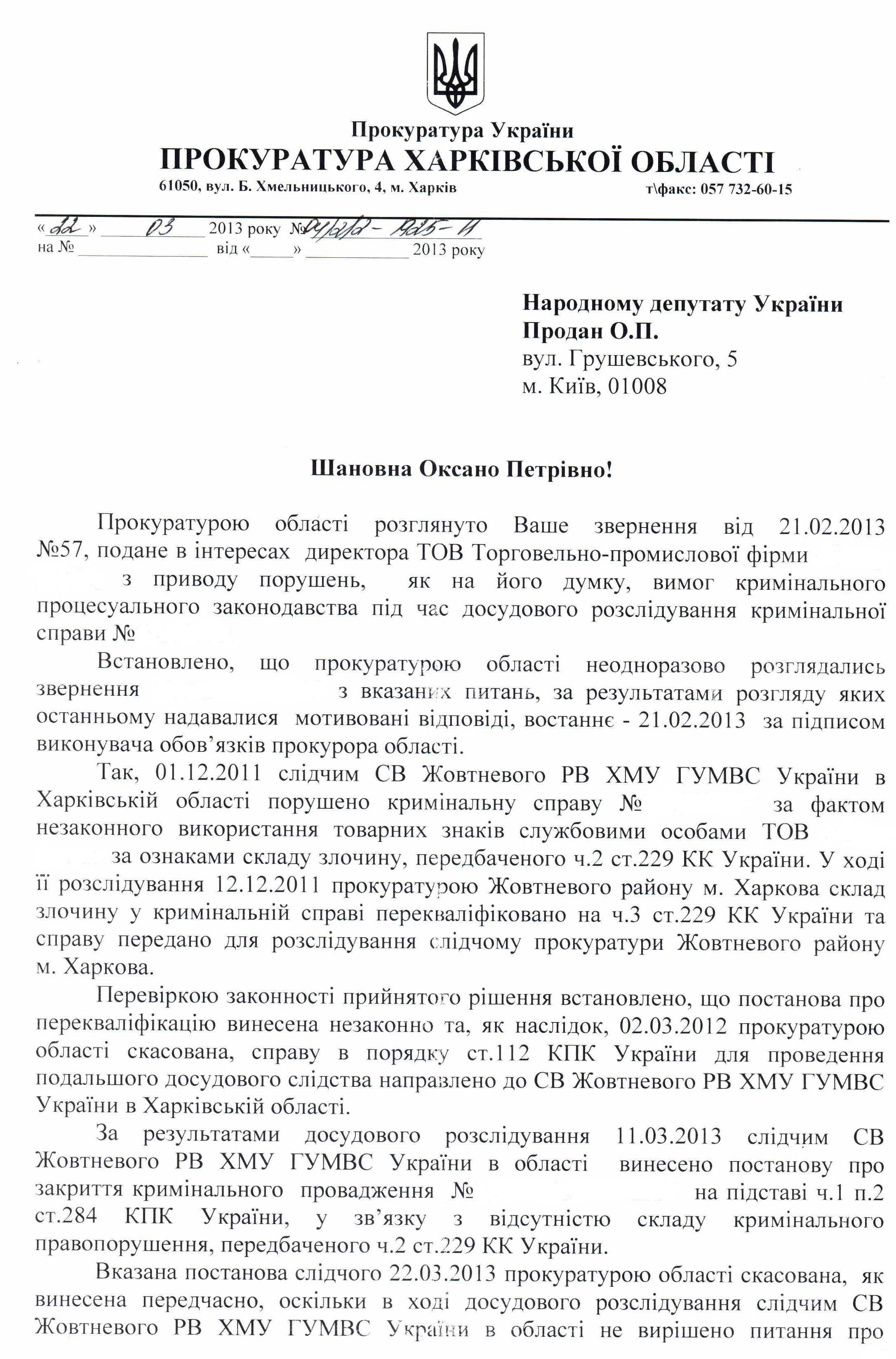 Відповідь Прокуратури Харківської області на депутатське звернення щодо здійснення неналежного розслідування кримінальної справи