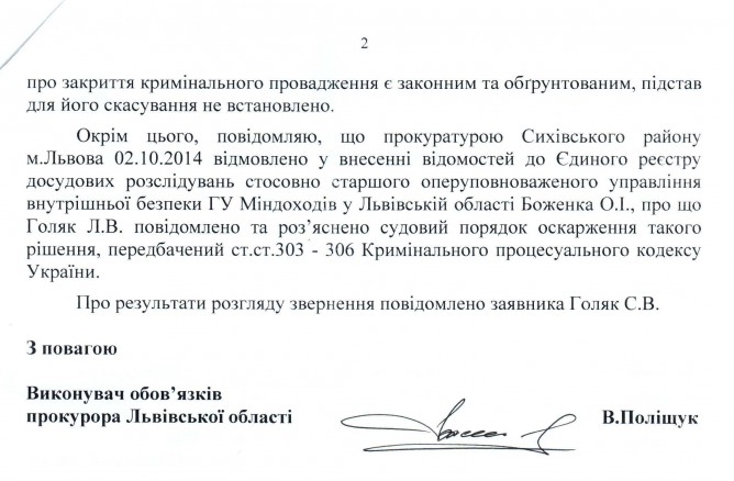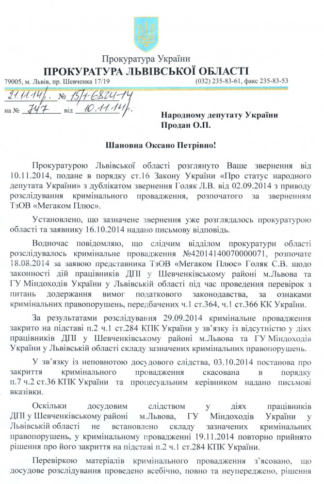 Вхідна документація > Відповідь Прокуратури Львівської області на депутатське звернення щодо перевірки законності закриття кримінального провадження у справі про порушення законодавства працівниками ДПІ у Шевченківському районі м. Львова