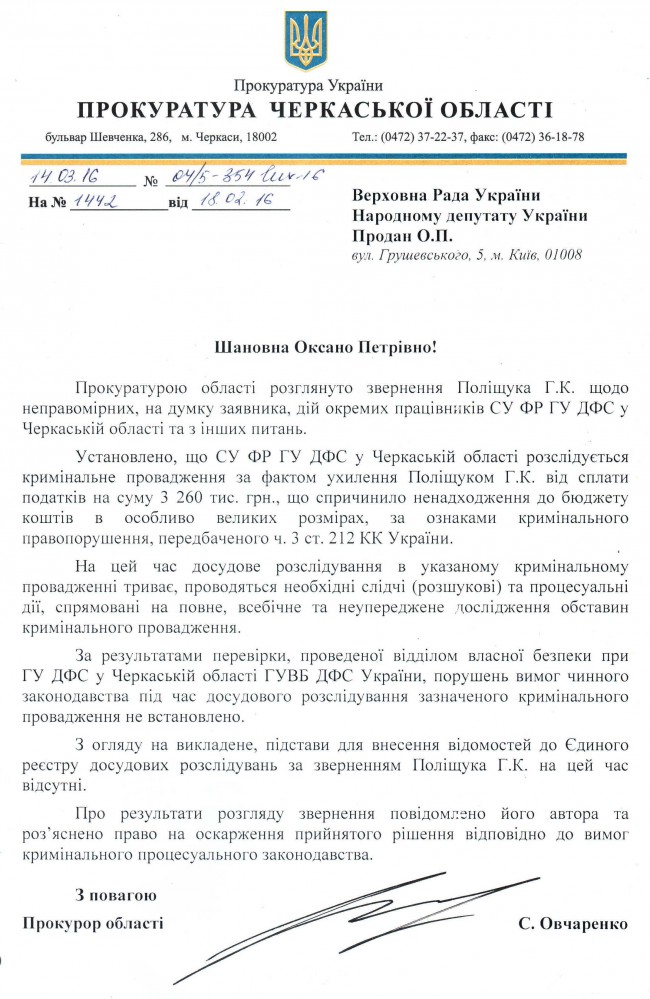 01Кві Коментування вимкнено Відповідь Прокуратури Черкаської області на депутатське звернення щодо можливого порушення законодавства співробітниками СУ ФР ГУ ДФС у Черкаській області та прокуратури Черкаської області ДЕПУТАТСЬКЕ ЗВЕРНЕННЯ