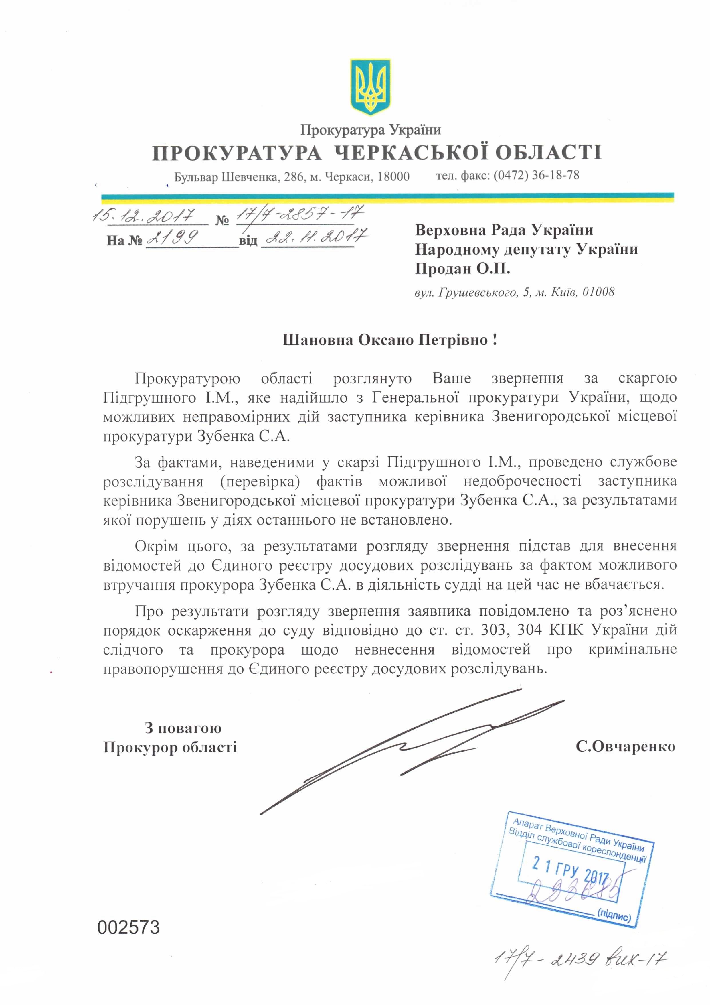 11Січ Коментування вимкнено Відповідь Прокуратури Черкаської області на депутатське звернення щодо можливих порушень законодавства співробітниками Звенигородської місцевої прокуратури Черкаської області ДЕПУТАТСЬКЕ ЗВЕРНЕННЯ