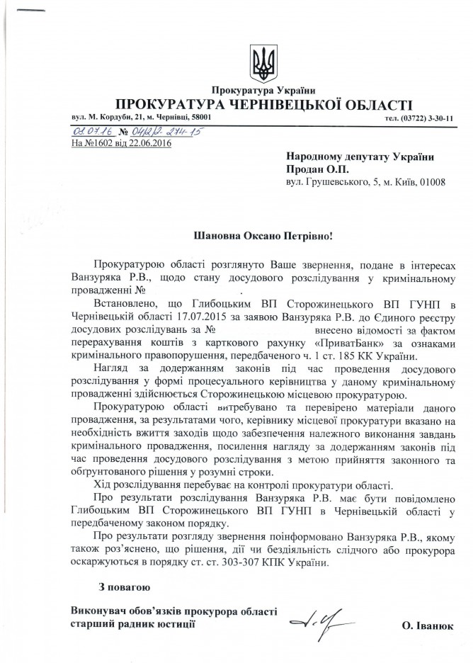 28Лип Коментування вимкнено Відповідь Прокуратури Чернівецької області на депутатське звернення щодо результатів досудового розслідування у кримінальному провадженні за фактом фінансового шахрайства ДЕПУТАТСЬКЕ ЗВЕРНЕННЯ