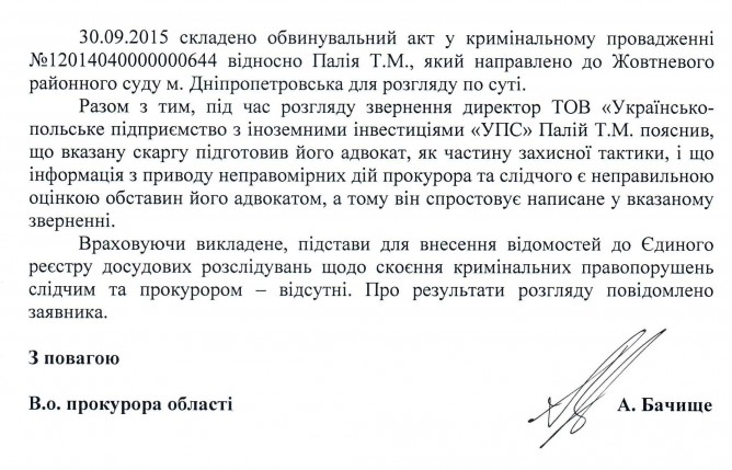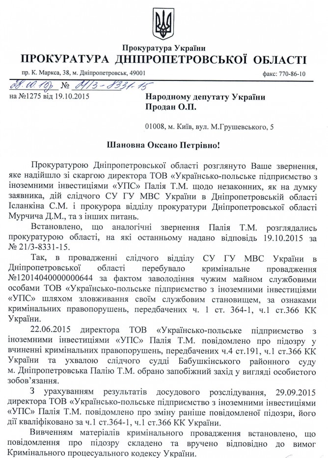 Вхідна документація > Відповідь прокуратури Дніпропетровської області на депутатське звернення щодо можливого порушення співробітниками прокуратури області та співробітниками СУ ГУ МВС України в Дніпропетровській області законодавства