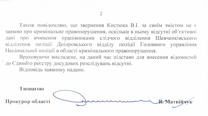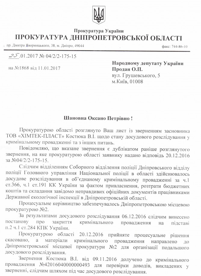 Вхідна документація > Відповідь прокуратури Дніпропетровської області на депутатське звернення щодо можливого порушення законодавства слідчими СВ Бабушкінського ВП Дніпропетровського ВП ГУ НП у Дніпропетровській області
