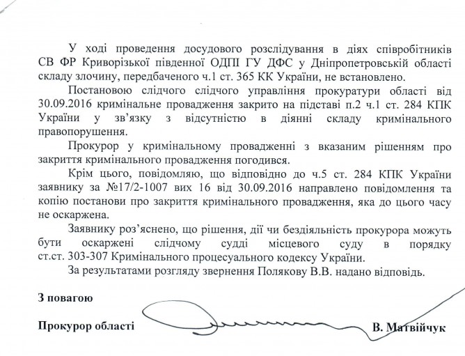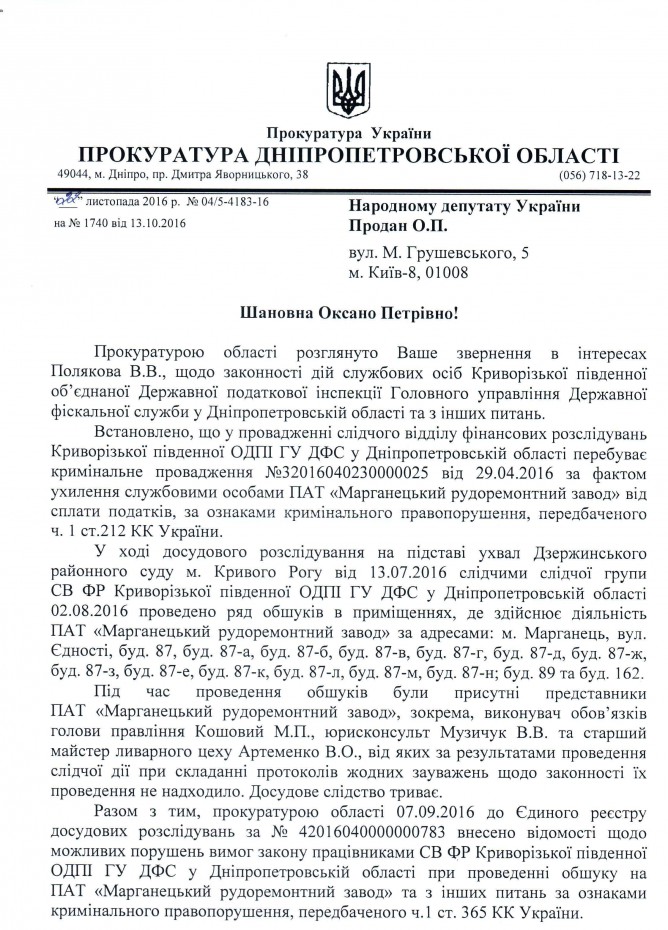 Вхідна документація > Відповідь Прокуратури Дніпропетровської області на депутатське звернення щодо можливих порушень законодавства співробітниками СВ ФР Криворізької південної ОДПІ ГУ ДФС у Дніпропетровській області