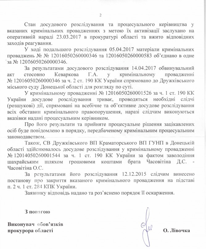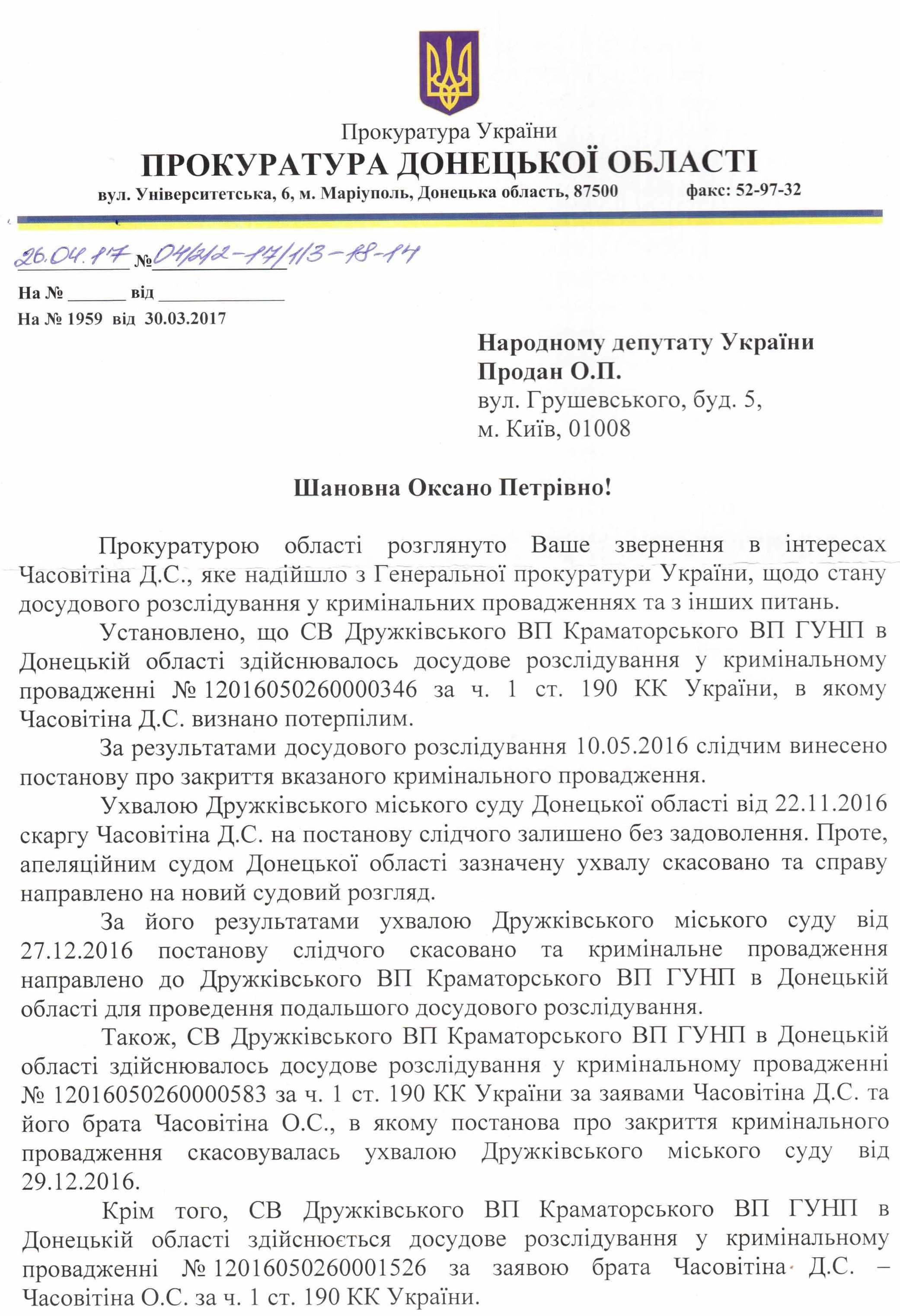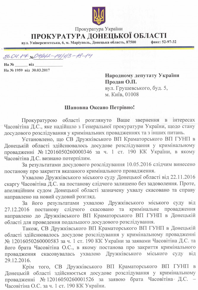 Відповідь Прокуратури Донецької області на депутатське звернення щодо можливих порушень законодавства співробітниками СВ Дріжківського ВП Краматорського ВП ГУНП в Донецькій області