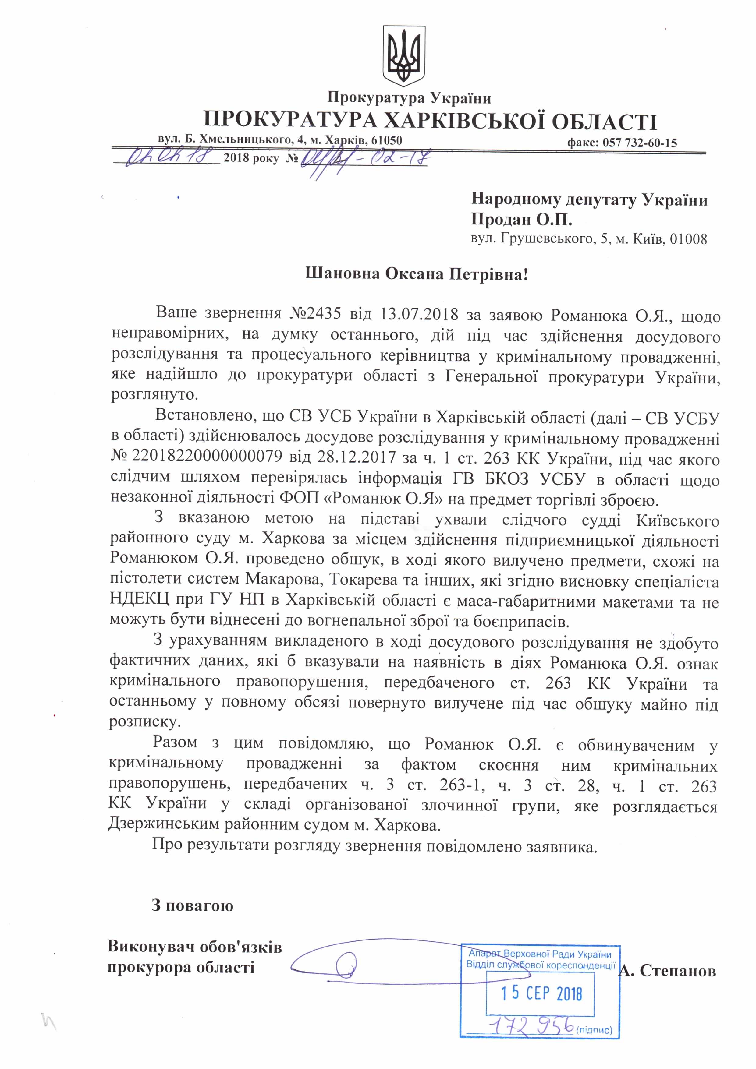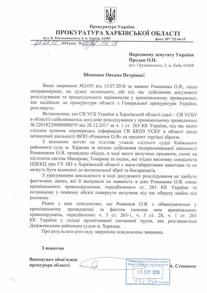 Відповідь Прокуратури Харківської області на депутатське звернення щодо можливого порушення співробітниками СВ Управління Служби безпеки України в Харківській області кримінального та кримінального процесуального законодавства