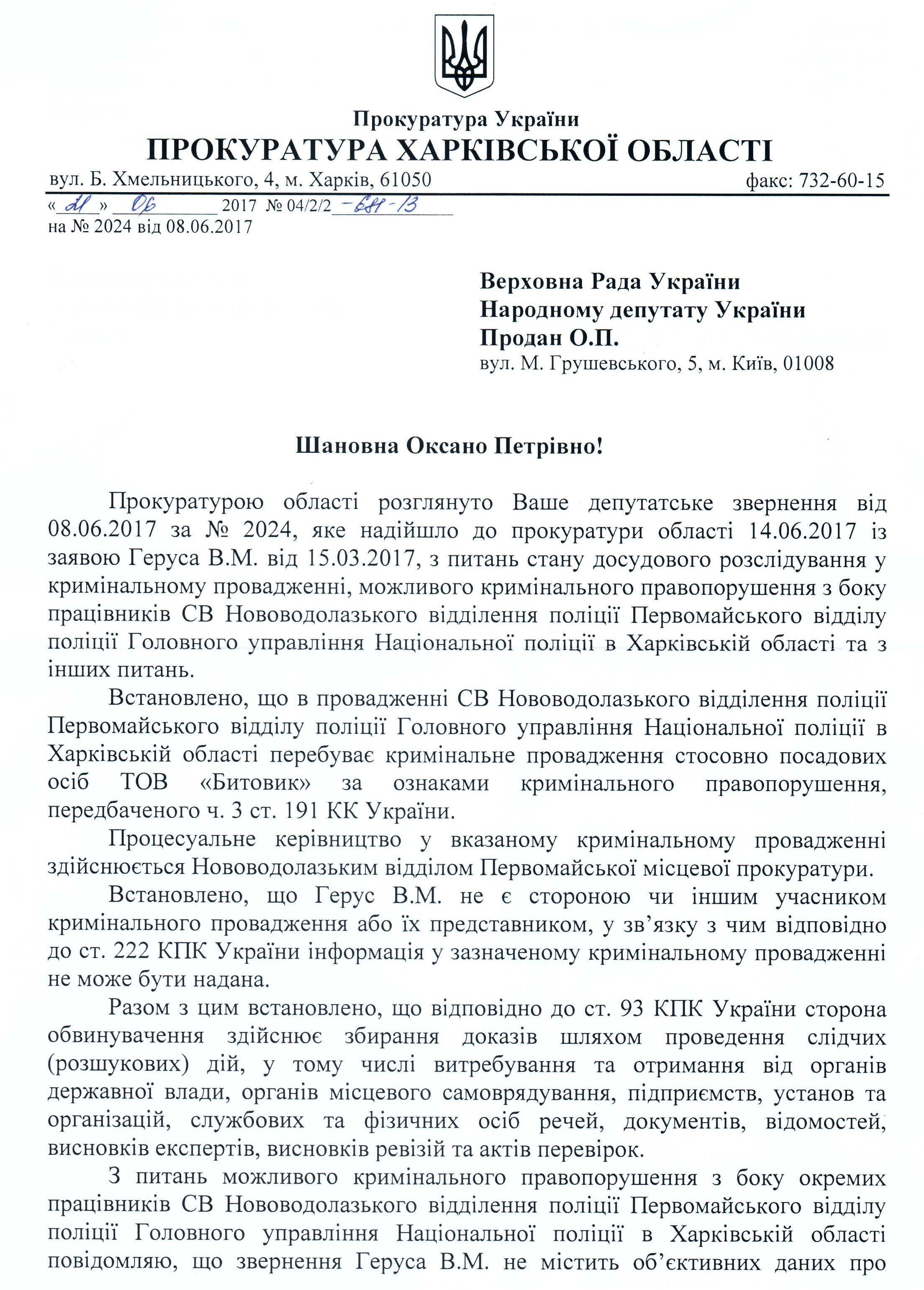 17Лип Коментування вимкнено Відповідь прокуратури Харківської області на депутатське звернення щодо можливих порушень законодавства співробітниками Нововодолазького ВП Первомайського ВП ГУ НП в Харківській області ДЕПУТАТСЬКЕ ЗВЕРНЕННЯ