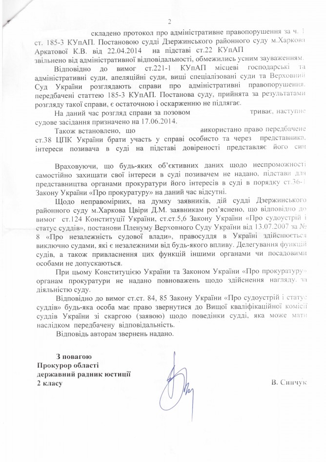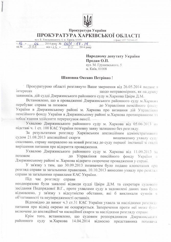 03Лип Коментування вимкнено Відповідь Прокуратури Харківськоїх області щодо проведення перевірки правомірності дій судді Дзержинського районного суду м. Харкова