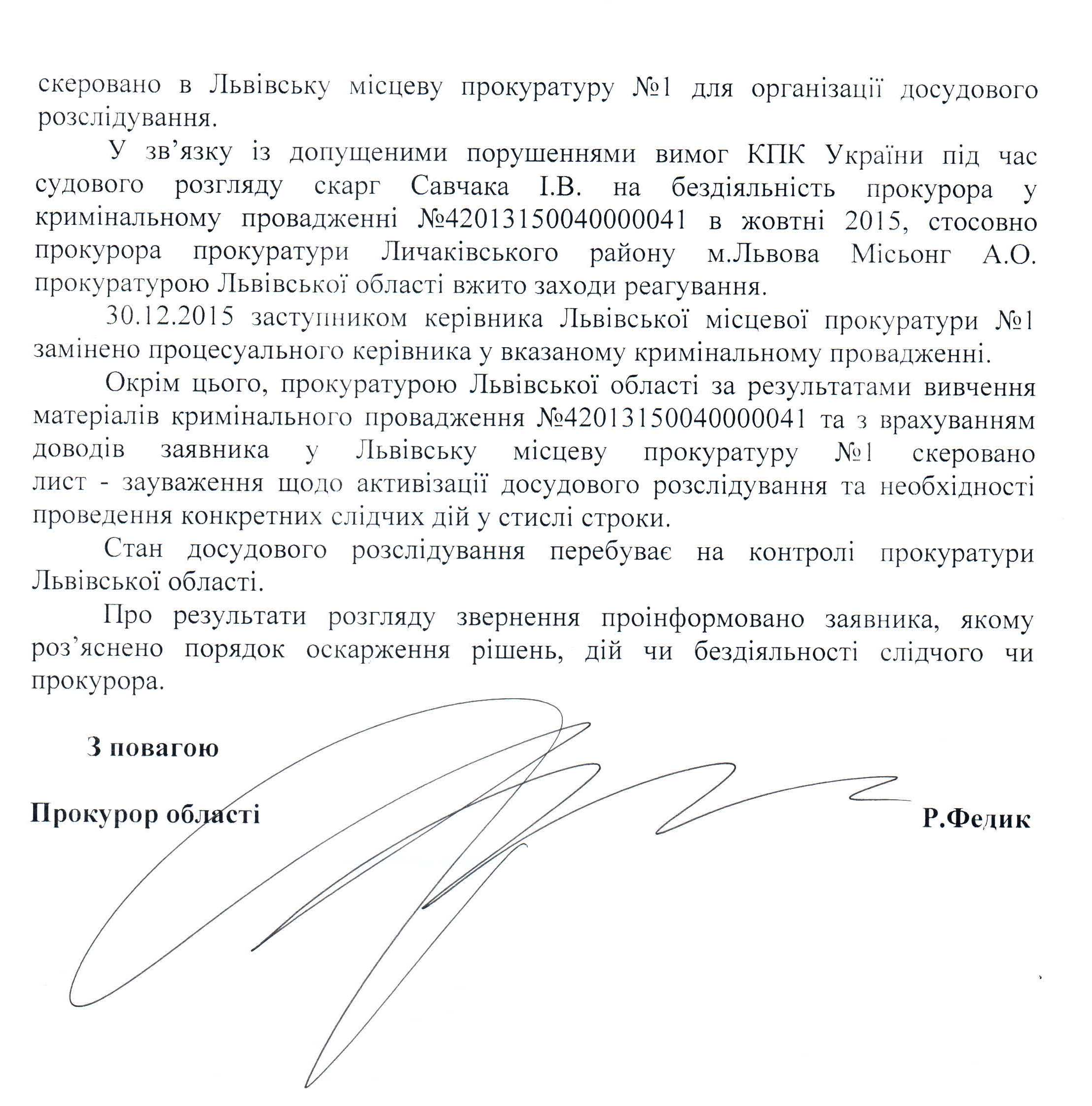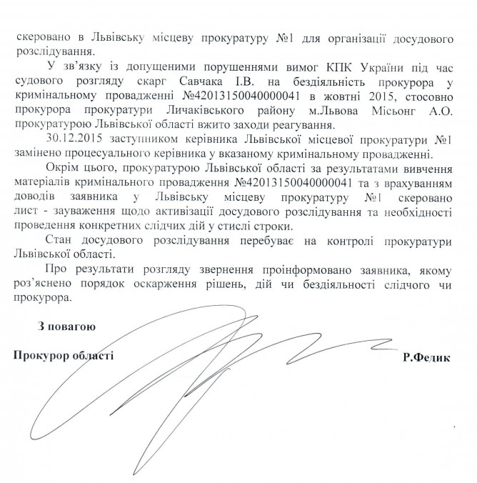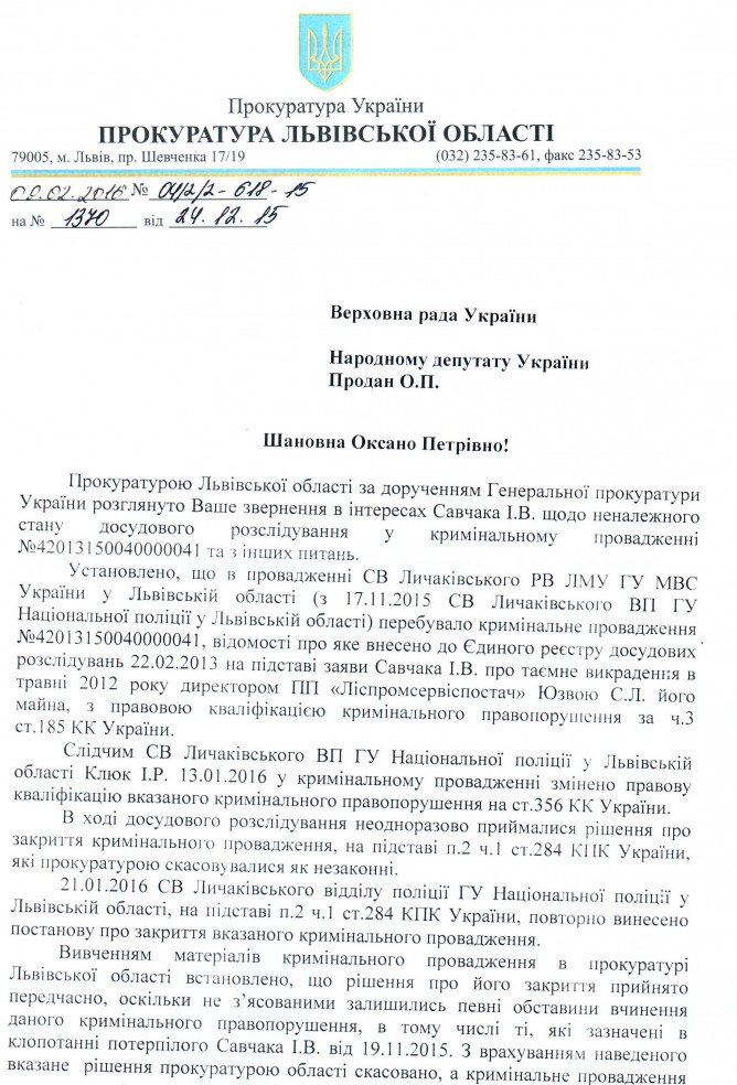 Вхідна документація > Відповідь прокуратури Львівської області на депутатське звернення до щодо систематичного порушення кримінального процесуального законодавства співробітниками правоохоронних органів Львівської області